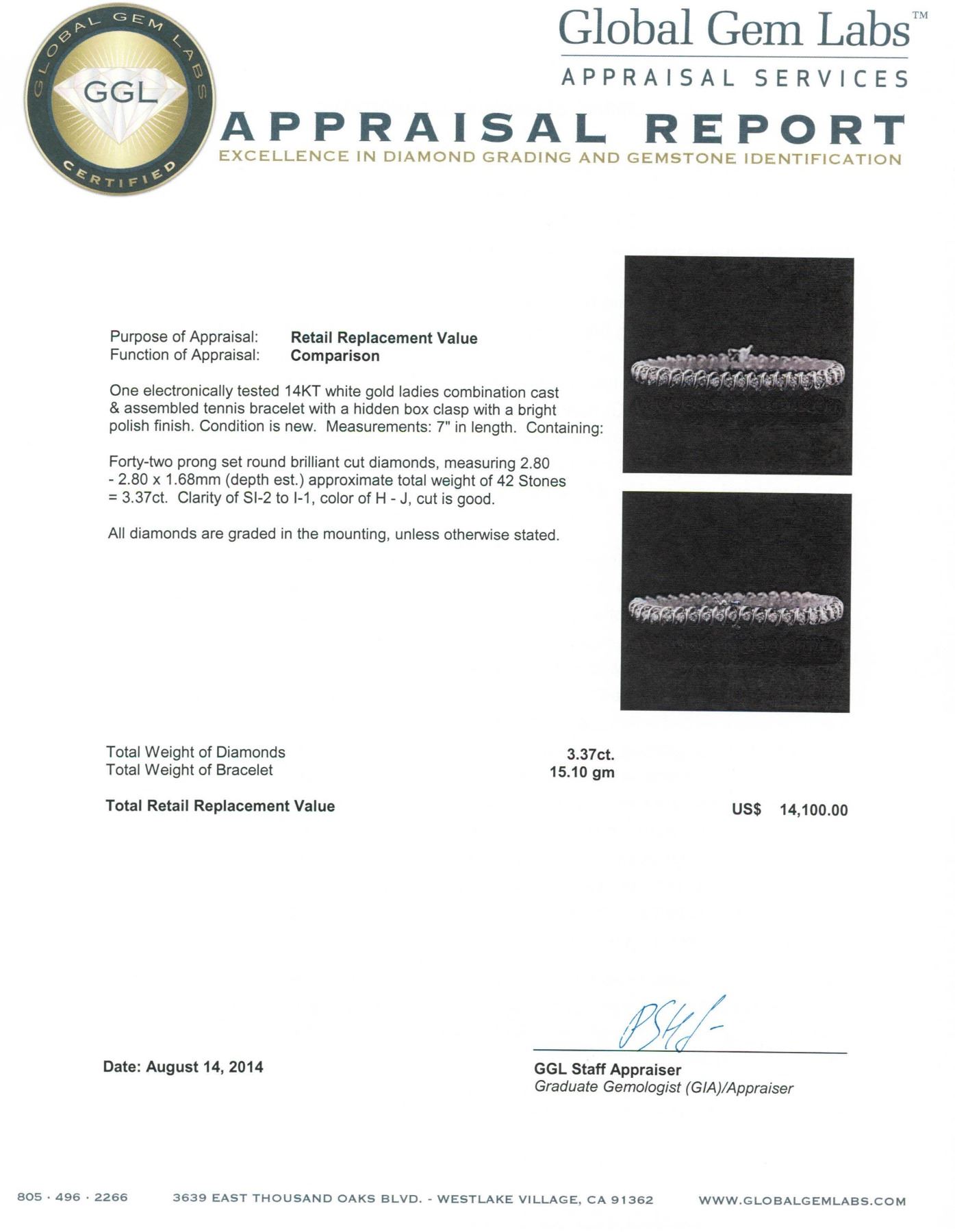 One electronically tested 14KT white gold ladies combination cast & assembled tennis bracelet with a hidden box clasp with a bright polish finish. Condition is new. Measurements: 7" in length. Containing: Forty-Two prong set round brilliant cut diamonds, measuring 2.80 - 2.80 x 1.68mm (depth est.) approximate total weight of 42 Stones = 3.37ct. Clarity: SI-2 to I-1. Color: H - J, Cut is Good. All diamonds are graded in the mounting, unless otherwise stated. Total Weight of Diamonds 3.37ct. Total Weight of Bracelet 15.10 grams. GGL Appraised.