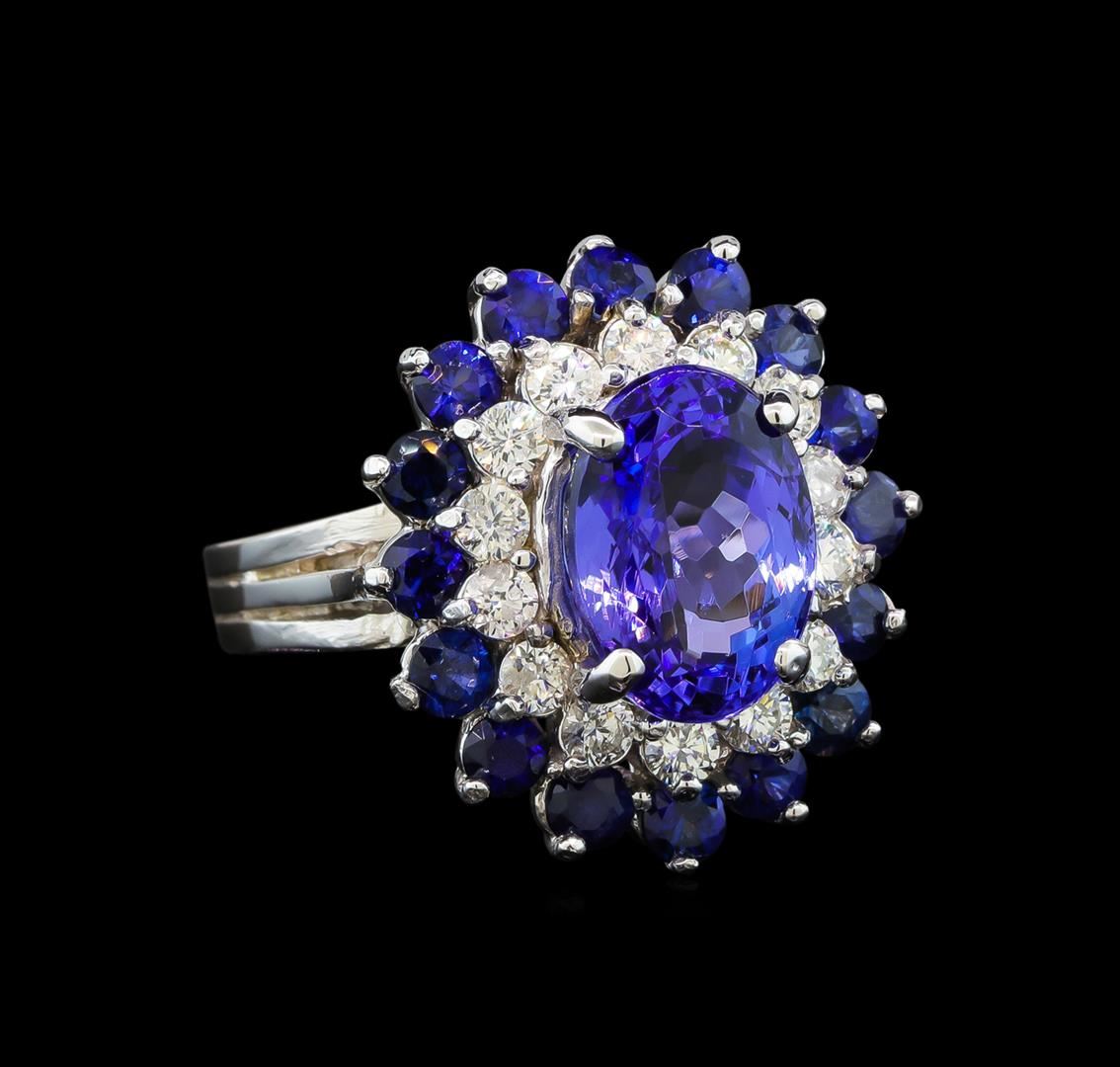 One electronically tested 14KT white gold ladies cast tanzanite, sapphire and diamond ring with a bright polish finish. Condition is new. Containing: One prong set oval modified brilliant cut natural tanzanite, measuring 11.50 x 8.00 x 5.20mm, approximate weight of 3.37ct., clarity is eye clean, type I, medium light, very slightly grayish, violet color, (GIA V 4/3), cut is good. Sixteen prong set round modified brilliant cut natural blue sapphires, measuring 3.00 - 3.00 x 1.95 mm, approximate total weight of 2.24ct., clarity is eye clean, type II, medium dark, moderately strong, blue color, (GIA B 6/4), cut is good. Fourteen prong set round brilliant cut diamonds, measuring 2.30 - 2.30 x 1.38mm (depth est.) approximate total weight of 14 Stones = 0.62ct. Clarity: SI-1 to SI-2. Color: I - J, Cut is Good. Colored gemstones are presumed to have been subjected to commonly used enhancement processes. All diamonds and colored gemstones are graded in the mounting, unless otherwise stated. Total Weight of Colored Stones 5.61ct. Total Weight of Diamonds 0.62ct. Total Weight of Ring 9.40 grams. GGL Appraised at $5,120.00.