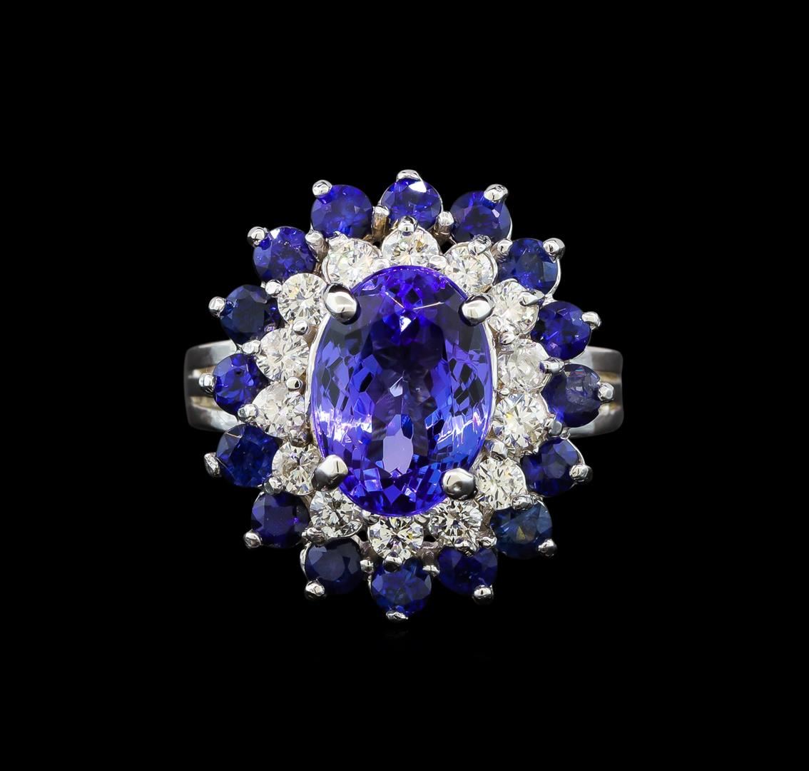 One electronically tested 14KT white gold ladies cast tanzanite, sapphire and diamond ring with a bright polish finish. Condition is new. Containing: One prong set oval modified brilliant cut natural tanzanite, measuring 11.50 x 8.00 x 5.20mm, approximate weight of 3.37ct., clarity is eye clean, type I, medium light, very slightly grayish, violet color, (GIA V 4/3), cut is good. Sixteen prong set round modified brilliant cut natural blue sapphires, measuring 3.00 - 3.00 x 1.95 mm, approximate total weight of 2.24ct., clarity is eye clean, type II, medium dark, moderately strong, blue color, (GIA B 6/4), cut is good. Fourteen prong set round brilliant cut diamonds, measuring 2.30 - 2.30 x 1.38mm (depth est.) approximate total weight of 14 Stones = 0.62ct. Clarity: SI-1 to SI-2. Color: I - J, Cut is Good. Colored gemstones are presumed to have been subjected to commonly used enhancement processes. All diamonds and colored gemstones are graded in the mounting, unless otherwise stated. Total Weight of Colored Stones 5.61ct. Total Weight of Diamonds 0.62ct. Total Weight of Ring 9.40 grams. GGL Appraised at $5,120.00.