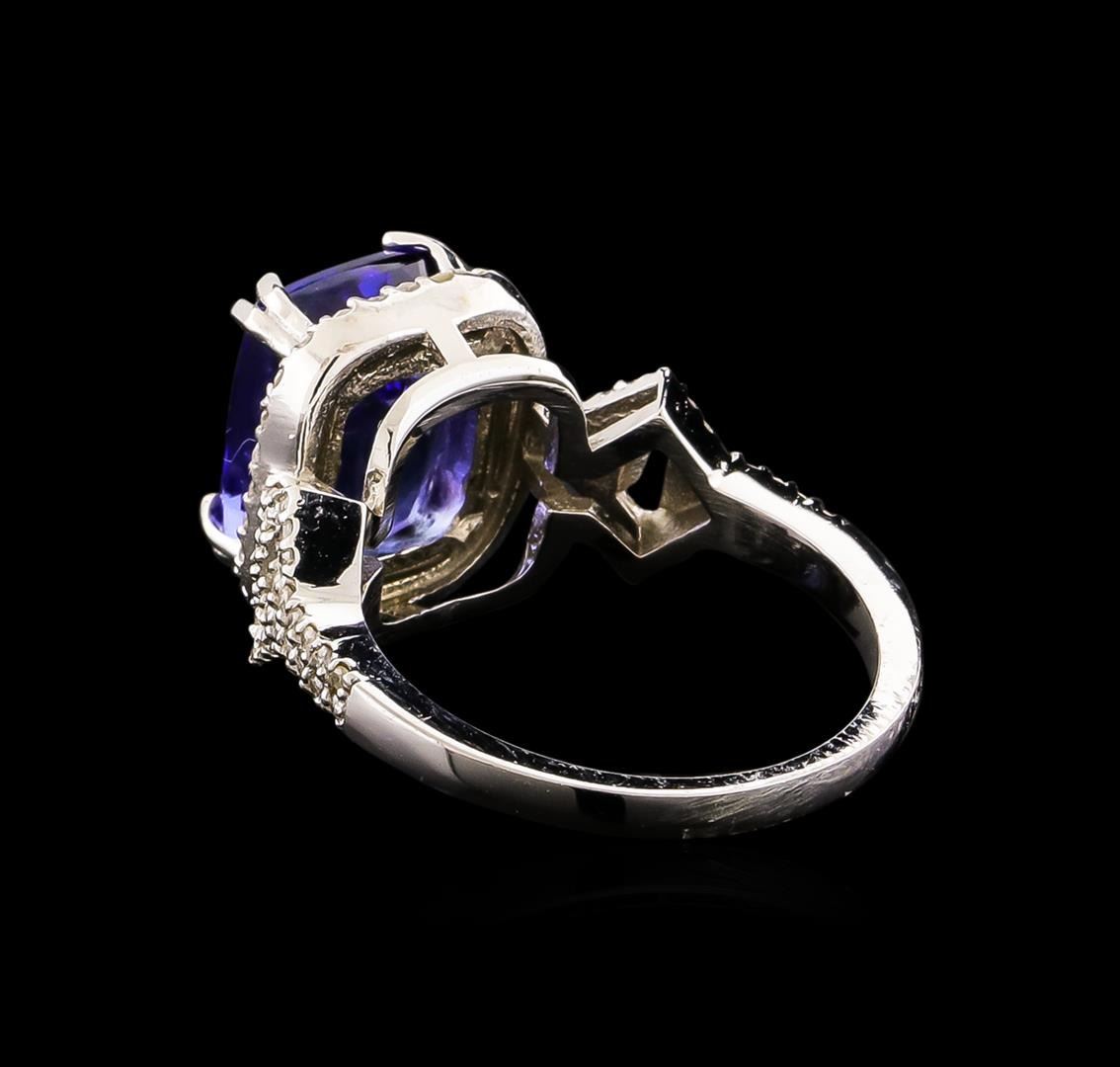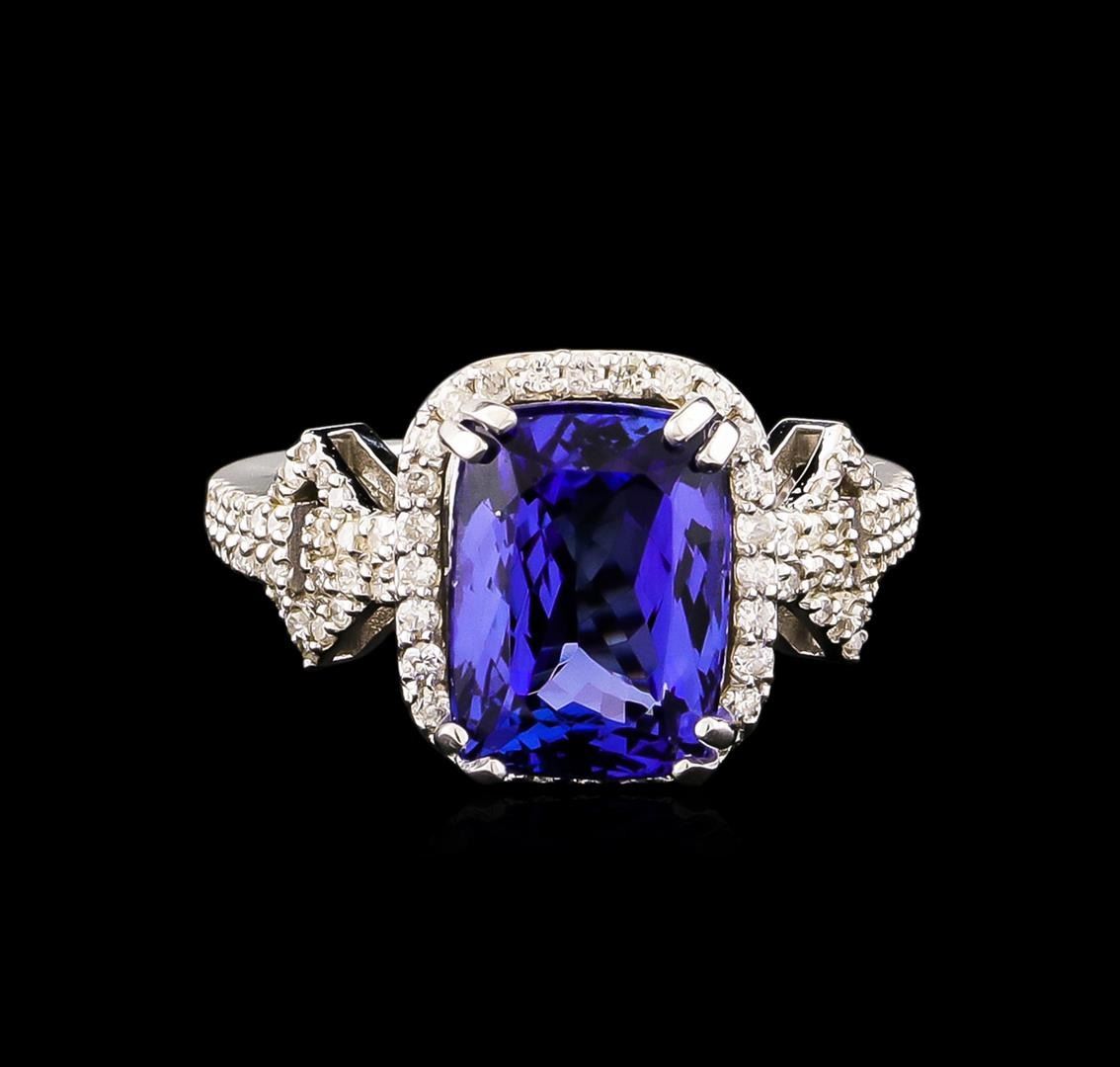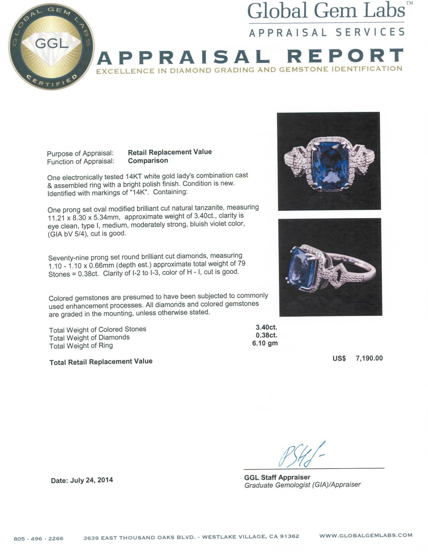 One electronically tested 14KT white gold ladies combination cast & assembled ring with a bright polish finish. Condition is new. Identified with markings of "14K". Containing: One prong set oval modified brilliant cut natural tanzanite, measuring 11.21 x 8.30 x 5.34mm, approximate weight of 3.40 ct., clarity is eye clean, type I, medium, moderately strong, bluish violet color, (GIA bV 5/4), cut is good. Seventy-Nine prong set round brilliant cut diamonds, measuring 1.10 - 1.10 x 0.66mm (depth est.) approximate total weight of 79 Stones = 0.38ct. Clarity: I-2 to I-3. Color: H - I, Cut is Good. Colored gemstones are presumed to have been subjected to commonly used enhancement processes. All diamonds and colored gemstones are graded in the mounting, unless otherwise stated. Total Weight of Colored Stones 3.40 ct. Total Weight of Diamonds 0.38ct. Total Weight of Ring 6.10 grams. GGL Appraised.