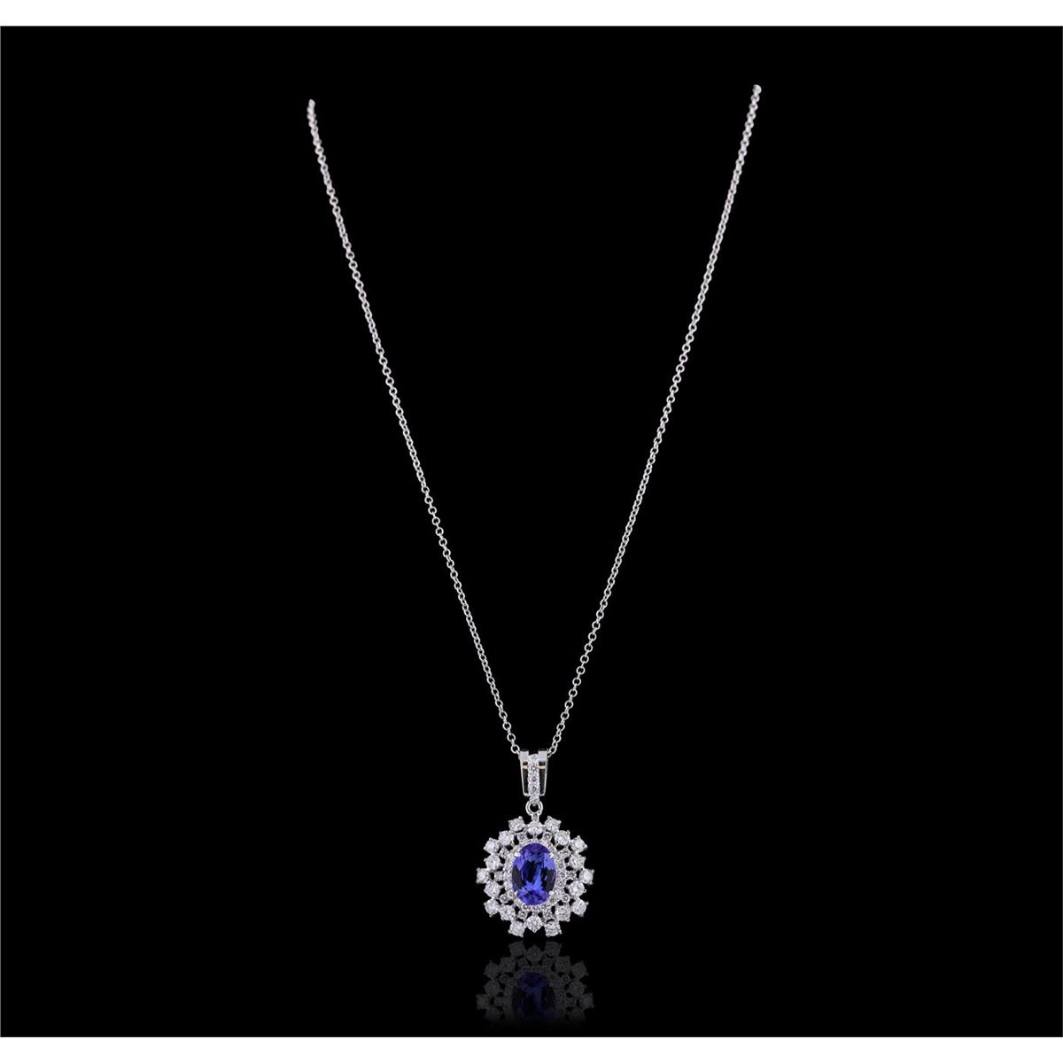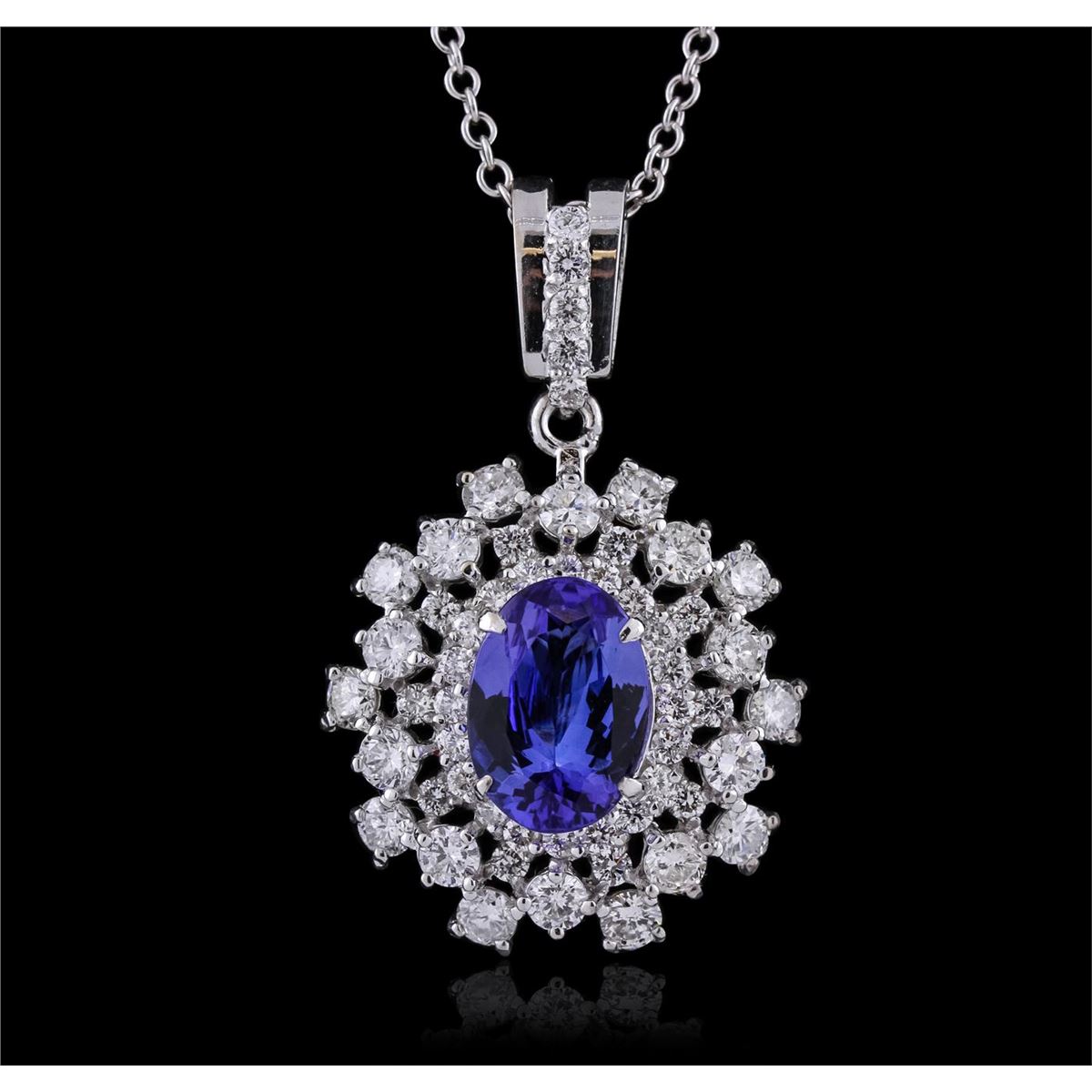 One electronically tested 14KT white gold ladies cast & assembled tanzanite and diamond pendant with chain. The pendant features a tanzanite set within a stylized diamond bezel, completed by a diamond set bail. The pendant is supported by an eighteen inch length 14KT white gold designer style chain, terminating in a lobster claw clasp. Bright polish finish. Identified with markings of "585". Condition is new, good workmanship. Containing: One prong set oval mixed cut natural tanzanite, measuring 12.00. x 8.40 x 4.60mm, 6%. bulge factor, approximate weight of 3.40ct., clarity is eye clean, type I, medium dark, very slightly grayish, bluish violet color, (GIA bV 6/3), cut is good. Transmitting light with no distortion, transparent. Graded in the setting. Tanzanite is a very rare gemstone that is only found in the country of Tanzania. Originally discovered in 1967. Tiffany & Company, named the stone Tanzanite. It is found in the Usumburu Mountains that border the Umba Valley of northern Tanzania. Tanzanite occurs in gray, brown, violet, blue, reddish-purple, & green. The gem is interesting because of its exceptional pleochroism. Rotated in different directions a tanzanite will exhibit multiple changes of color. Tanzanite has a low tolerance to ultrasonic cleaning, and should not be cleaned using this method. Twenty prong set round brilliant cut diamonds, measuring 3.00. - 2.90 x 1.77mm (depth est.) approximate total weight of 20 Stones = 1.97ct. Graded in the setting. Clarity: SI-1 to I-1 . Color: G - I Thirty-Five prong set round brilliant cut diamonds, measuring 2.00. - 1.90 x 1.17mm (depth est.) approximate total weight of 35 Stones = 1.05ct. Graded in the setting. Clarity: SI-1 to I-1 . Color: G - I. Total Weight of Colored Stones 3.40ct. Total Weight of Diamonds 3.02ct. Total Weight of Pendant With Chain 9.68 grams. AIG Appraised at $18,750.00.