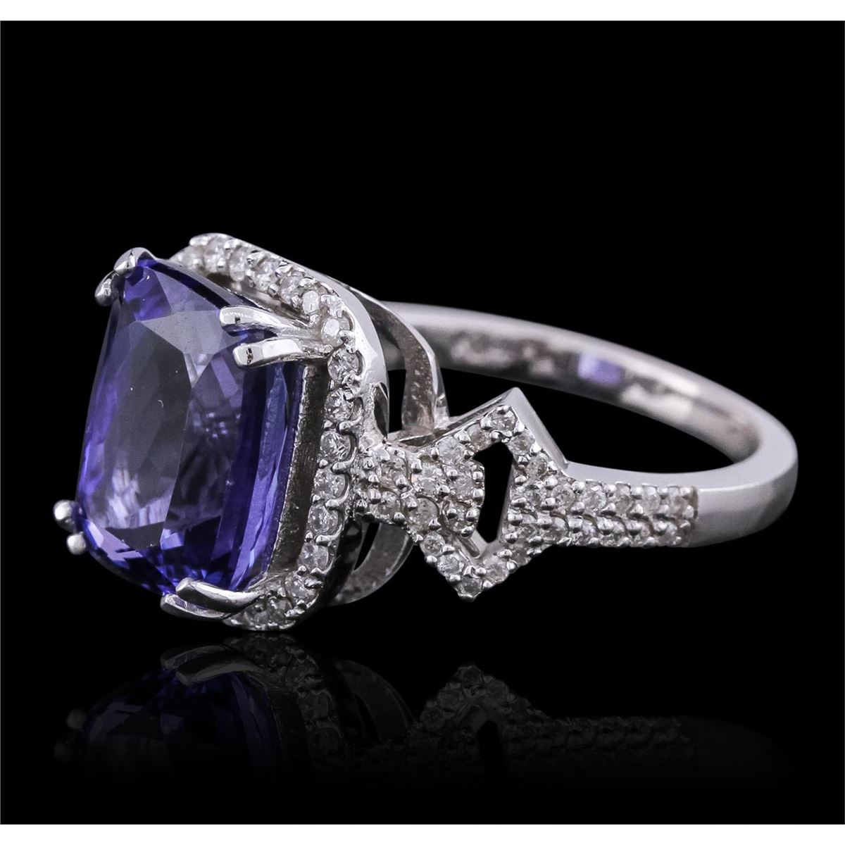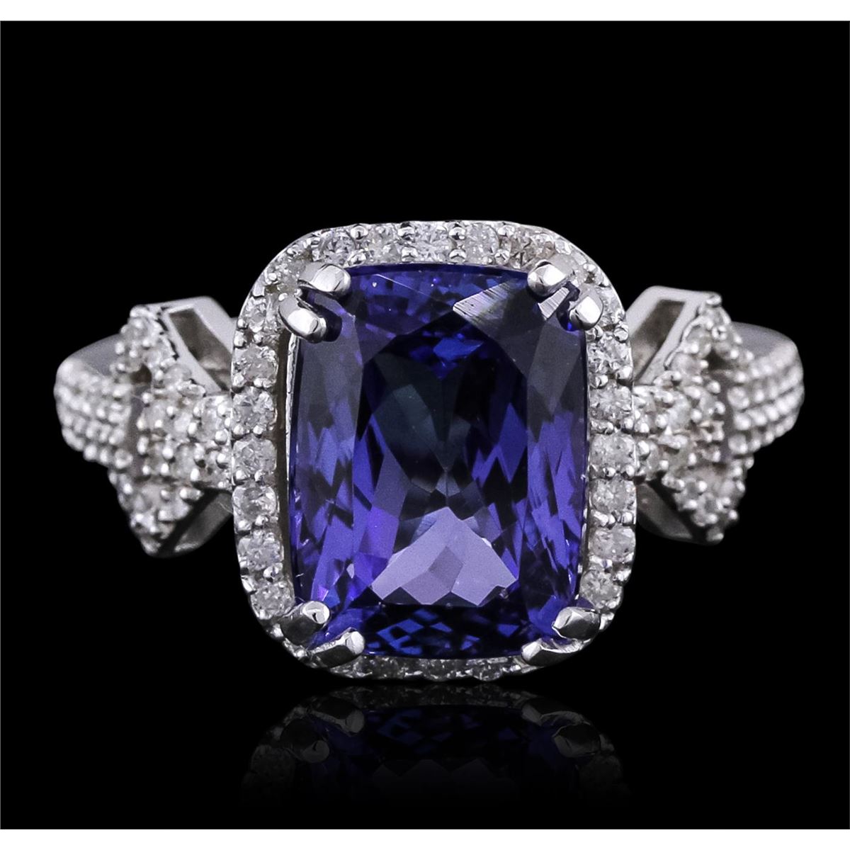 One electronically tested 14KT white gold ladies combination cast & assembled ring with a bright polish finish. Condition is new. Identified with markings of "14K". Containing: One prong set oval modified brilliant cut natural tanzanite, measuring 11.21 x 8.30 x 5.34mm, approximate weight of 3.40ct., clarity is eye clean, type I, medium, moderately strong, bluish violet color, (GIA bV 5/4), cut is good. Seventy-Nine prong set round brilliant cut diamonds, measuring 1.10 - 1.10 x 0.66mm (depth est.) approximate total weight of 79 Stones = 0.38ct. Clarity: I-2 to I-3. Color: H - I, Cut is Good. Colored gemstones are presumed to have been subjected to commonly used enhancement processes. All diamonds and colored gemstones are graded in the mounting, unless otherwise stated. Total Weight of Colored Stones 3.40ct. Total Weight of Diamonds 0.38ct. Total Weight of Ring 6.10 grams. GGL Appraised at $7,190.00.