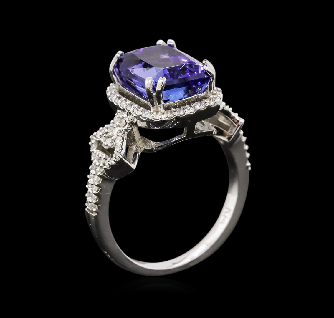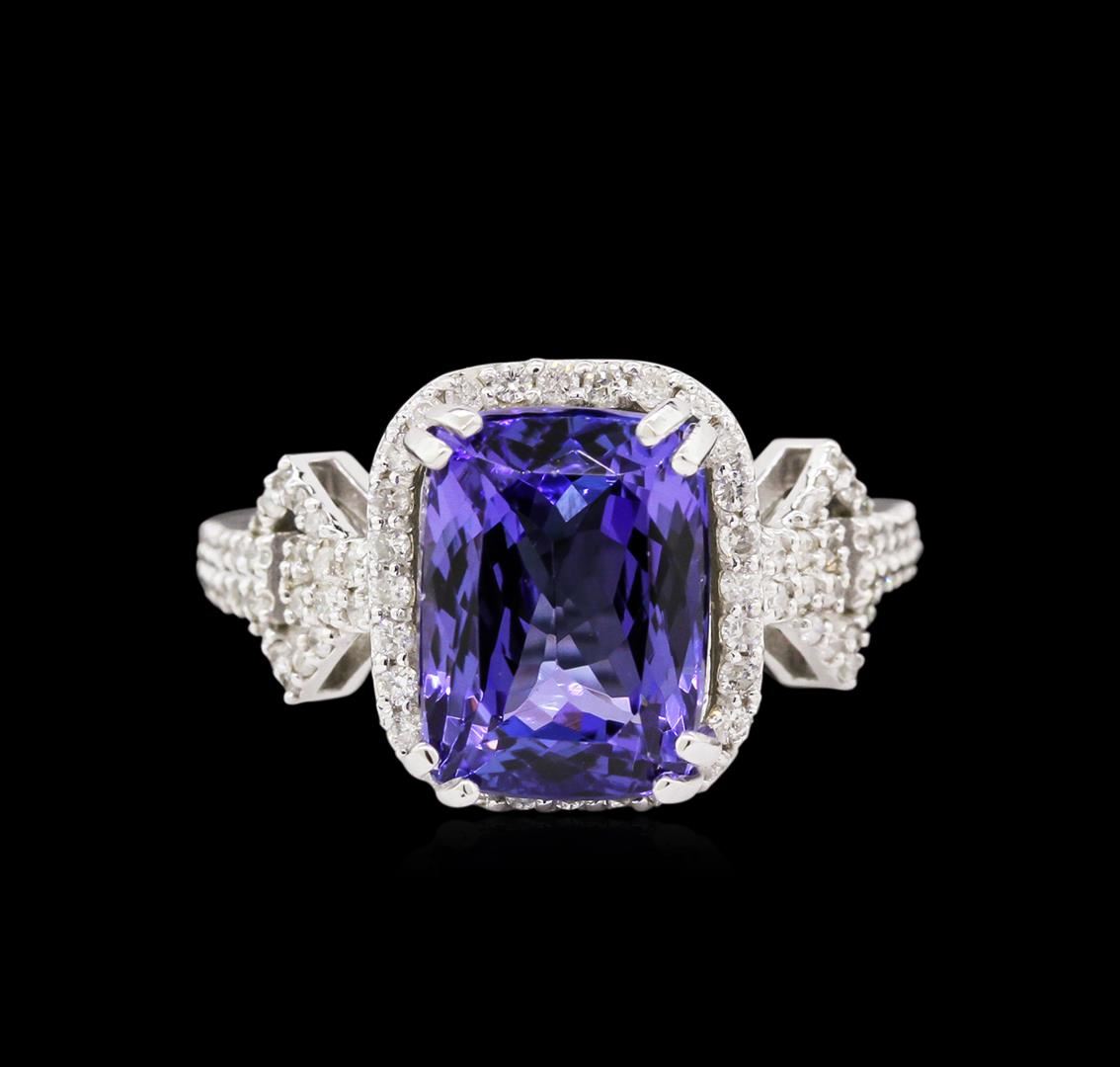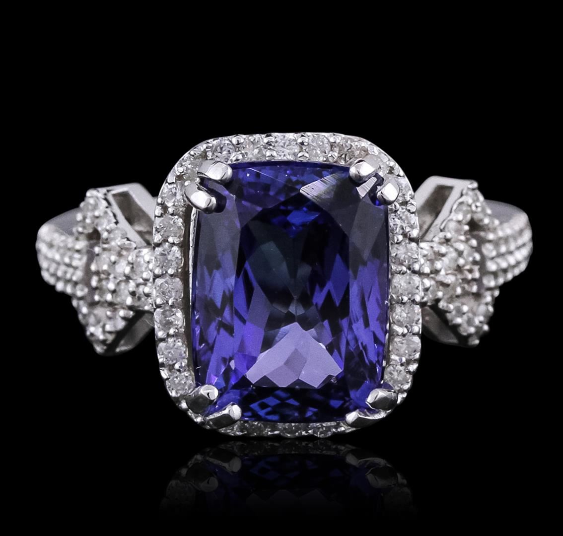 One electronically tested 14KT white gold ladies combination cast & assembled ring with a bright polish finish. Condition is new. Identified with markings of "14K". Containing: One prong set oval modified brilliant cut natural tanzanite, measuring 11.21 x 8.30 x 5.34mm, approximate weight of 3.40ct., clarity is eye clean, type I, medium, moderately strong, bluish violet color, (GIA bV 5/4), cut is good. Seventy-Nine prong set round brilliant cut diamonds, measuring 1.10 - 1.10 x 0.66mm (depth est.) approximate total weight of 79 Stones = 0.38ct. Clarity: I-2 to I-3. Color: H - I, Cut is Good. Colored gemstones are presumed to have been subjected to commonly used enhancement processes. All diamonds and colored gemstones are graded in the mounting, unless otherwise stated. Total Weight of Colored Stones 3.40ct. Total Weight of Diamonds 0.38ct. Total Weight of Ring 6.10 grams. GGL Appraised at $7,190.00.