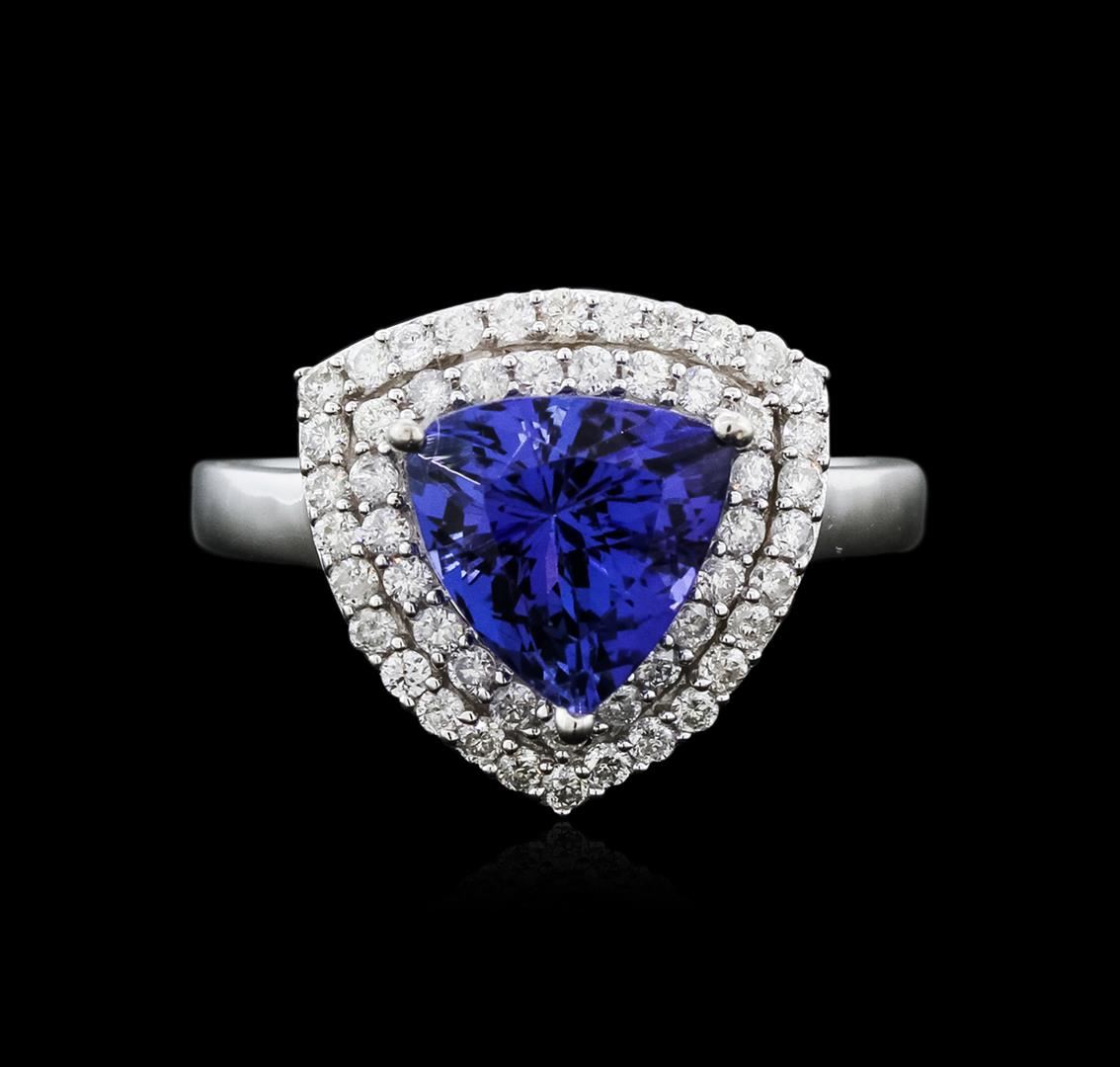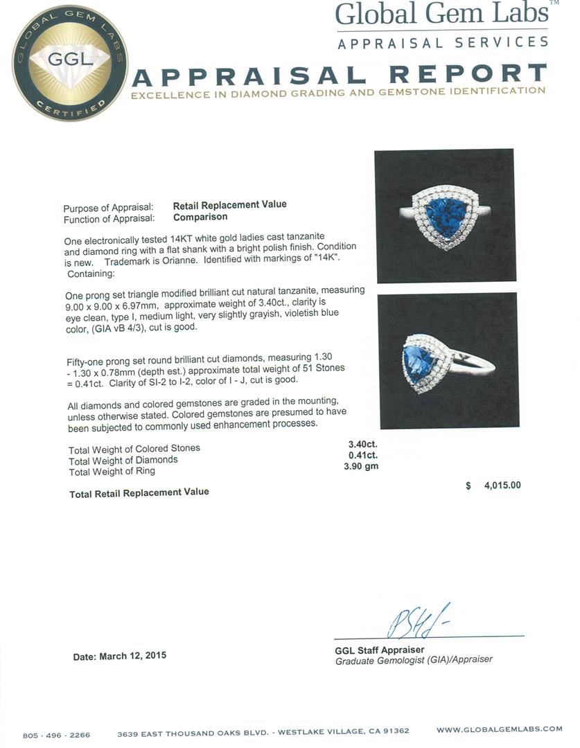 One electronically tested 14KT white gold ladies cast tanzanite and diamond ring with a flat shank with a bright polish finish. Trademark is Orianne. Identified with markings of "14K". Condition is new. Containing: One prong set triangle modified brilliant cut natural tanzanite, measuring 9.00 x 9.00 x 6.97mm, approximate weight of 3.40ct., clarity is eye clean, type I, medium light, very slightly grayish, violetish blue color, (GIA vB 4/3), cut is good. Fifty-One prong set round brilliant cut diamonds, measuring 1.30 - 1.30 x 0.78mm (depth est.) approximate total weight of 51 Stones = 0.41ct. Clarity: SI-2 to I-2. Color: I - J, Cut is Good. All diamonds and colored gemstones are graded in the mounting, unless otherwise stated. Colored gemstones are presumed to have been subjected to commonly used enhancement processes. Total Weight of Colored Stones 3.40ct. Total Weight of Diamonds 0.41ct. Total Weight of Ring 3.90 grams. GGL Appraised at $4,015.00.