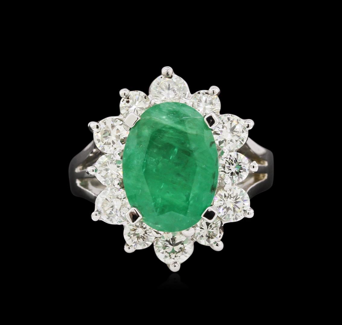 One electronically tested 14KT white gold ladies combination cast & assembled ring with a bright polish finish. Condition is new. Identified with markings of "14K". Containing: One prong set oval modified brilliant cut natural emerald, measuring 11.82 x 8.70 x 5.96mm, approximate weight of 3.41ct., clarity is heavily included, type III, medium, moderately strong, green color, (GIA G 5/4), cut is good. Twelve prong set round brilliant cut diamonds, measuring 3.00 - 2.60 x 1.68mm (depth est.) approximate total weight of 12 Stones = 1.00ct. Clarity: SI-2 to I-1. Color: I - J, Cut is Good. Colored gemstones are presumed to have been subjected to commonly used enhancement processes. All diamonds and colored gemstones are graded in the mounting, unless otherwise stated. Total Weight of Colored Stones 3.41ct. Total Weight of Diamonds 1.00ct. Total Weight of Ring 7.00 grams. GGL Appraised at $11,650.00.
