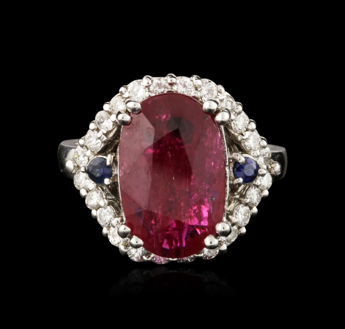 One electronically tested 14KT white gold ladies cast ruby, sapphire and diamond ring with a bright polish finish. Identified with markings of "14K". Condition is new. Containing: One prong set oval modified brilliant cut natural ruby, measuring 13.60 x 9.20 x 3.20mm, approximate weight of 3.41ct., clarity is heavily included, medium, moderately strong, strongly purplish red color, (GIA stpR 5/4), cut is good. Two prong set round modified brilliant cut natural blue sapphires, measuring 2.20 - 2.20 x 1.43 mm, approximate total weight of 0.12ct., clarity is heavily included, type II, medium, moderately strong, blue color, (GIA B 5/4), cut is good. Twenty-Four prong set round brilliant cut diamonds, measuring 1.90 - 1.90 x 1.14mm (depth est.) approximate total weight of 24 Stones = 0.60ct. Clarity: SI-1. Color: I - J, Cut is Good. Colored gemstones are presumed to have been subjected to commonly used enhancement processes. All diamonds and colored gemstones are graded in the mounting, unless otherwise stated. Total Weight of Colored Stones 3.53ct. Total Weight of Diamonds 0.60ct. Total Weight of Ring 6.00 grams. GGL Appraised at $3,635.00.