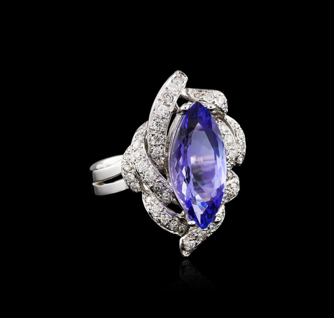 One electronically tested 14KT white gold ladies cast tanzanite and diamond ring with a split shoulder shank with a bright polish finish. Identified with markings of "K14". Condition is new. Containing: One prong set marquise modified brilliant cut natural tanzanite, measuring 17.00 x 6.97 x 4.53mm, approximate weight of 3.42ct., clarity is eye clean, type I, medium light, moderately strong, violet color, (GIA V 4/4), cut is good. Forty-Five prong set round brilliant cut diamonds, measuring 1.30 - 1.30 x 0.78mm (depth est.) approximate total weight of 45 Stones = 0.36ct. Clarity of SI-1 to I-1, Color of I - J, Cut is Good. All diamonds and colored gemstones are graded in the mounting, unless otherwise stated. Colored gemstones are presumed to have been subjected to commonly used enhancement processes. Total Weight of Colored Stones 3.42ct. Total Weight of Diamonds 0.36ct. Total Weight of Ring 7.60 grams. GGL Appraised at $5,220.00.