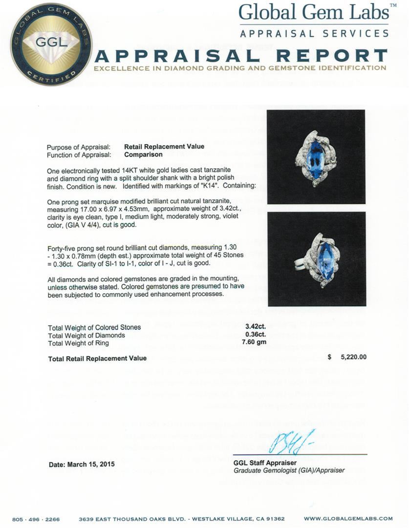 One electronically tested 14KT white gold ladies cast tanzanite and diamond ring with a split shoulder shank with a bright polish finish. Identified with markings of "K14". Condition is new. Containing: One prong set marquise modified brilliant cut natural tanzanite, measuring 17.00 x 6.97 x 4.53mm, approximate weight of 3.42ct., clarity is eye clean, type I, medium light, moderately strong, violet color, (GIA V 4/4), cut is good. Forty-Five prong set round brilliant cut diamonds, measuring 1.30 - 1.30 x 0.78mm (depth est.) approximate total weight of 45 Stones = 0.36ct. Clarity of SI-1 to I-1, Color of I - J, Cut is Good. All diamonds and colored gemstones are graded in the mounting, unless otherwise stated. Colored gemstones are presumed to have been subjected to commonly used enhancement processes. Total Weight of Colored Stones 3.42ct. Total Weight of Diamonds 0.36ct. Total Weight of Ring 7.60 grams. GGL Appraised at $5,220.00.