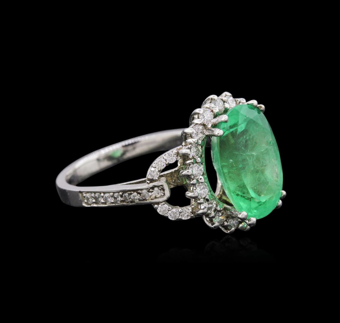 One electronically tested 14KT white gold ladies combination cast & assembled emerald and diamond ring with a split shank with a bright polish finish. Identified with markings of "14K". Condition is new. Containing: One prong set oval modified step cut natural emerald, measuring 12.40 x 8.62 x 5.60mm, approximate weight of 3.42ct., clarity is heavily included, type III, medium light, very slightly grayish, very slightly bluish green color, (GIA vslbG 4/3), cut is good. Twenty-Eight prong set round brilliant cut diamonds, measuring 1.00 - 1.00 x 0.60mm (depth est.) approximate total weight of 28 Stones = 0.10ct. Clarity: I-1. Color: H - I, Cut is Good. Eighteen prong set round brilliant cut diamonds, measuring 1.70 - 1.70 x 1.02mm (depth est.) approximate total weight of 18 Stones = 0.32ct. Clarity: SI-2 to I-1. Color: J, Cut is Good. All diamonds and colored gemstones are graded in the mounting, unless otherwise stated. Colored gemstones are presumed to have been subjected to commonly used enhancement processes. Total Weight of Colored Stones 3.42ct. Total Weight of Diamonds 0.42ct. Total Weight of Ring 4.30 grams. GGL Appraised at $8,995.00.