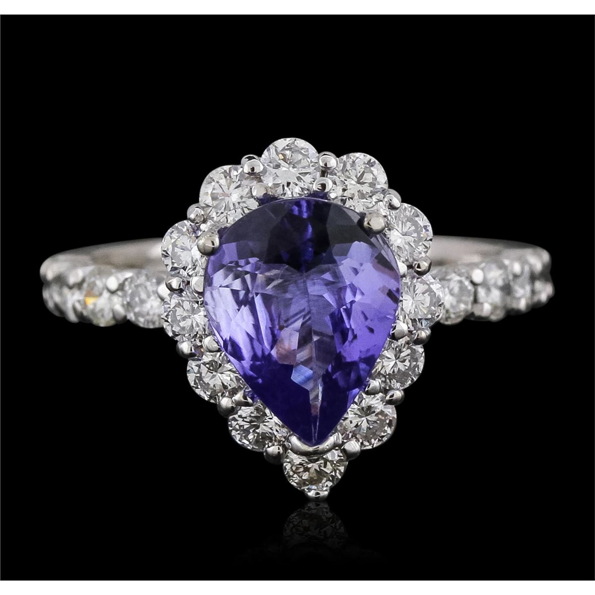 One electronically tested 14KT white gold ladies combination cast & assembled tanzanite and diamond ring with a flat shank with a bright polish finish. Identified with markings of "K14". Condition is new. Containing: One prong set pear modified brilliant cut natural tanzanite, measuring 10.50 x 8.30 x 5.86mm, approximate weight of 3.42ct., clarity is eye clean, type I, medium light, very slightly grayish, violet color, (GIA V 4/3), cut is good. Twenty-Two prong set round brilliant cut diamonds, measuring 2.50 - 2.30 x 1.44mm (depth est.) approximate total weight of 22 Stones = 1.11ct. Clarity: SI-1 to SI-2. Color: I - J, Cut is Good. Colored gemstones are presumed to have been subjected to commonly used enhancement processes. All diamonds and colored gemstones are graded in the mounting, unless otherwise stated. Total Weight of Colored Stones 3.42ct. Total Weight of Diamonds 1.11ct. Total Weight of Ring 4.40 grams. GGL Appraised at $8,700.00.