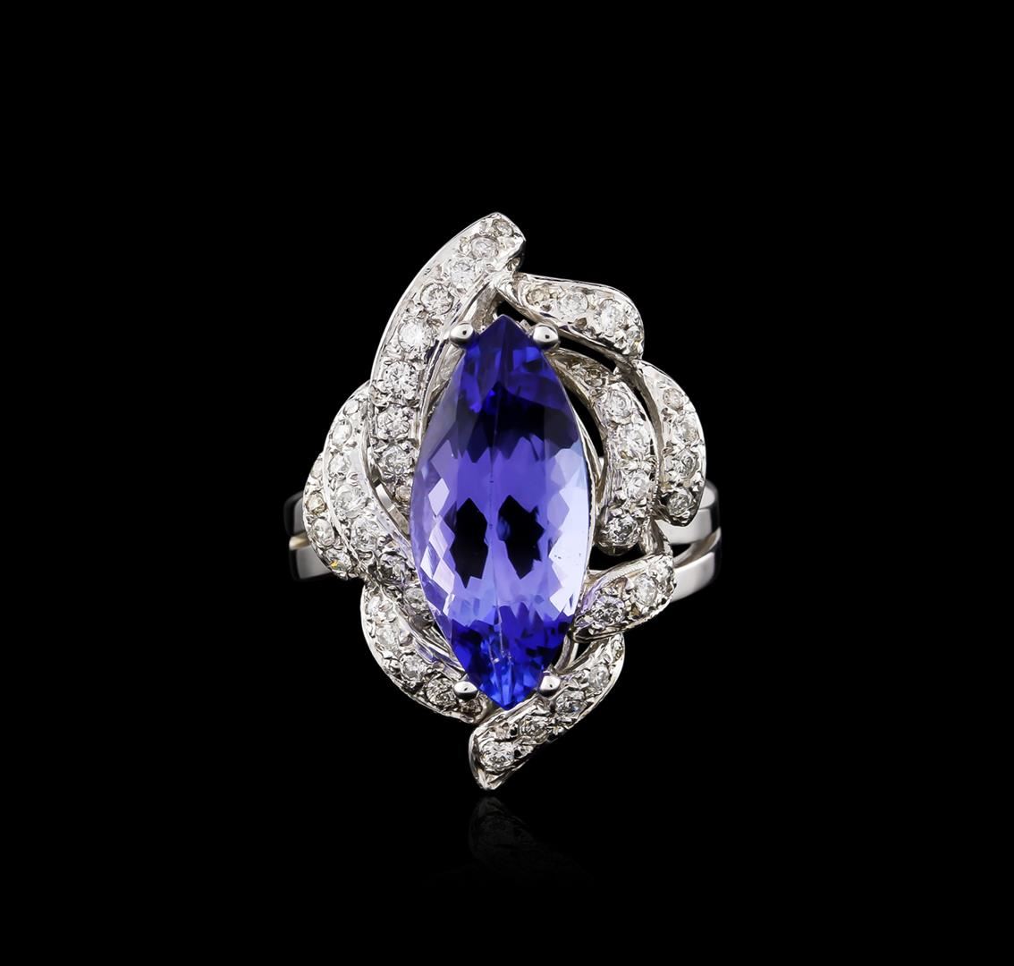 One electronically tested 14KT white gold ladies cast tanzanite and diamond ring with a split shoulder shank with a bright polish finish. Identified with markings of "K14". Condition is new. Containing: One prong set marquise modified brilliant cut natural tanzanite, measuring 17.00 x 6.97 x 4.53mm, approximate weight of 3.42ct., clarity is eye clean, type I, medium light, moderately strong, violet color, (GIA V 4/4), cut is good. Forty-Five prong set round brilliant cut diamonds, measuring 1.30 - 1.30 x 0.78mm (depth est.) approximate total weight of 45 Stones = 0.36ct. Clarity of SI-1 to I-1, Color of I - J, Cut is Good. All diamonds and colored gemstones are graded in the mounting, unless otherwise stated. Colored gemstones are presumed to have been subjected to commonly used enhancement processes. Total Weight of Colored Stones 3.42ct. Total Weight of Diamonds 0.36ct. Total Weight of Ring 7.60 grams. GGL Appraised at $5,220.00.