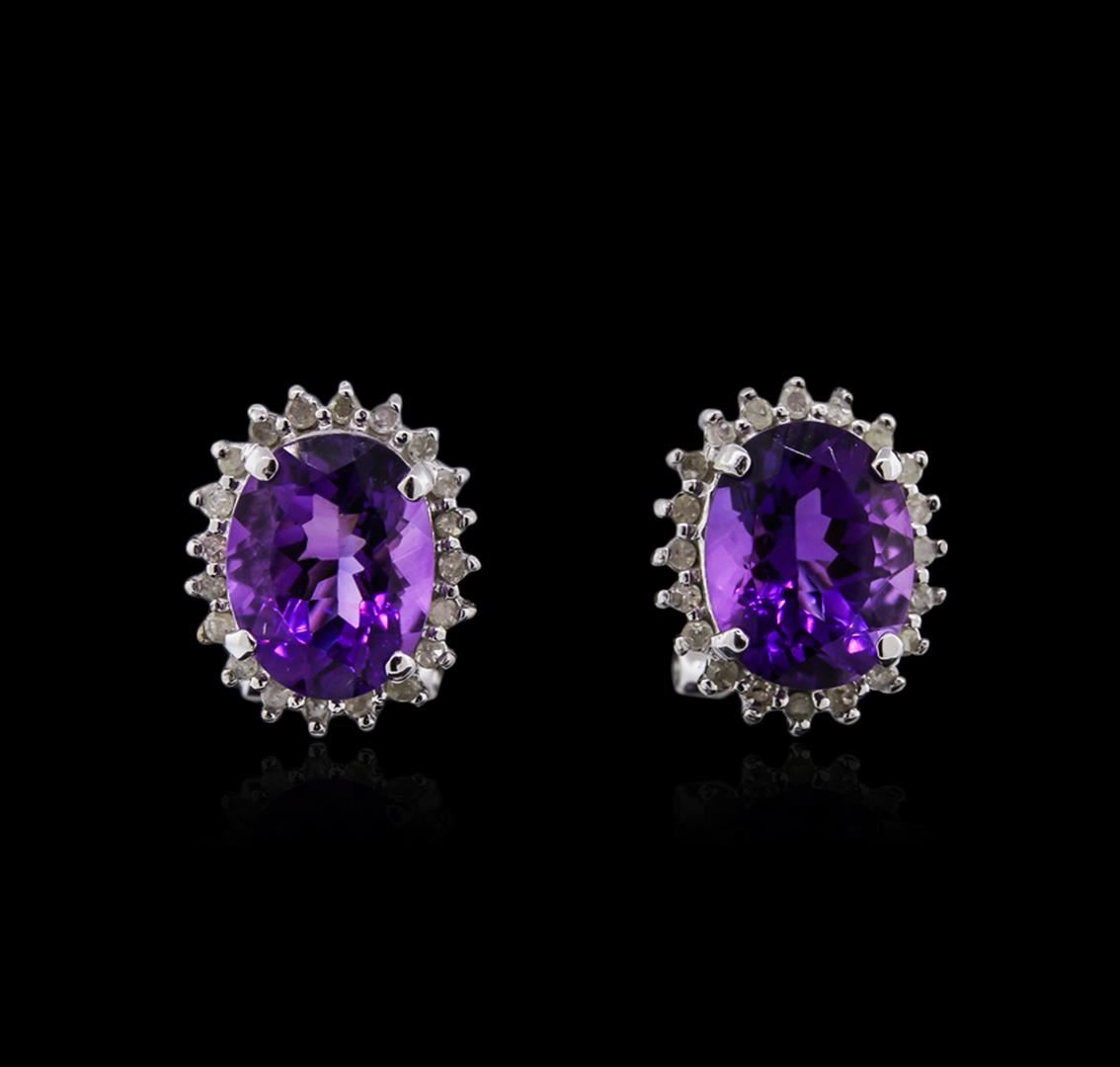 One pair of earrings featuring: 14KT white gold weighing 2.95 grams containing two amethyst with a total weight of 3.42ct and diamonds with a total weight of 0.23ct.