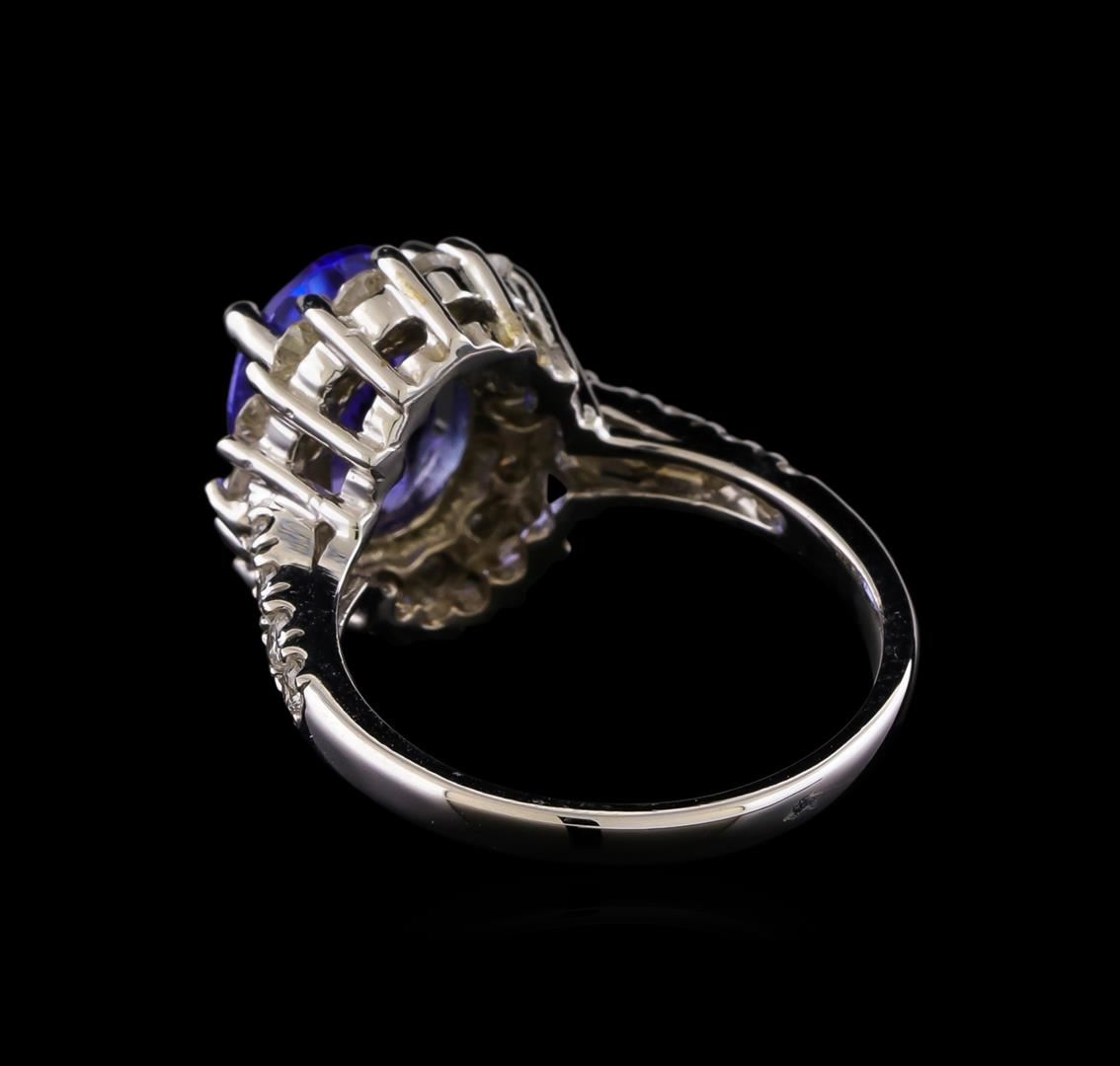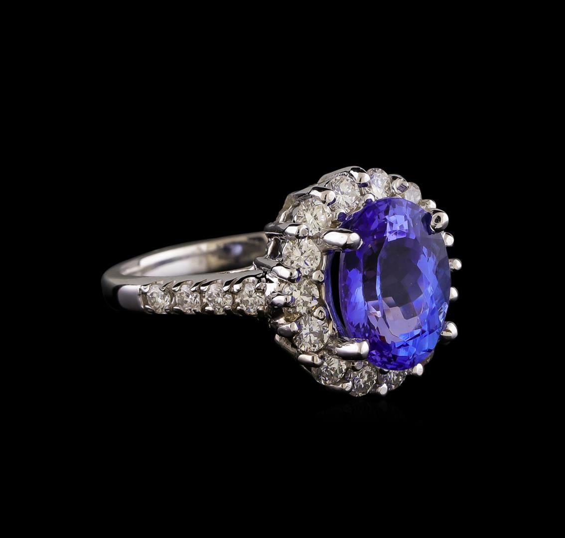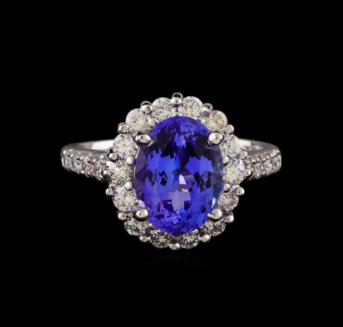 One electronically tested 14KT white gold ladies combination cast & assembled tanzanite and diamond ring with a bright polish finish. Identified with markings of "14K". Condition is new. Containing: One prong set oval modified brilliant cut natural tanzanite, measuring 10.78 x 8.02 x 5.79mm, approximate weight of 3.43ct., clarity is eye clean, type I, medium, moderately strong, violet color, (GIA V 5/4), cut is good. Twenty-Two prong set round brilliant cut diamonds, measuring 2.00 - 2.00 x 1.20mm (depth est.) approximate total weight of 22 Stones = 0.64ct. Clarity: SI-2 to I-1. Color: I - J, Cut is Good. Colored gemstones are presumed to have been subjected to commonly used enhancement processes. All diamonds and colored gemstones are graded in the mounting, unless otherwise stated. Total Weight of Colored Stones 3.43ct. Total Weight of Diamonds 0.64ct. Total Weight of Ring 5.90 grams. GGL Appraised at $6,360.00.