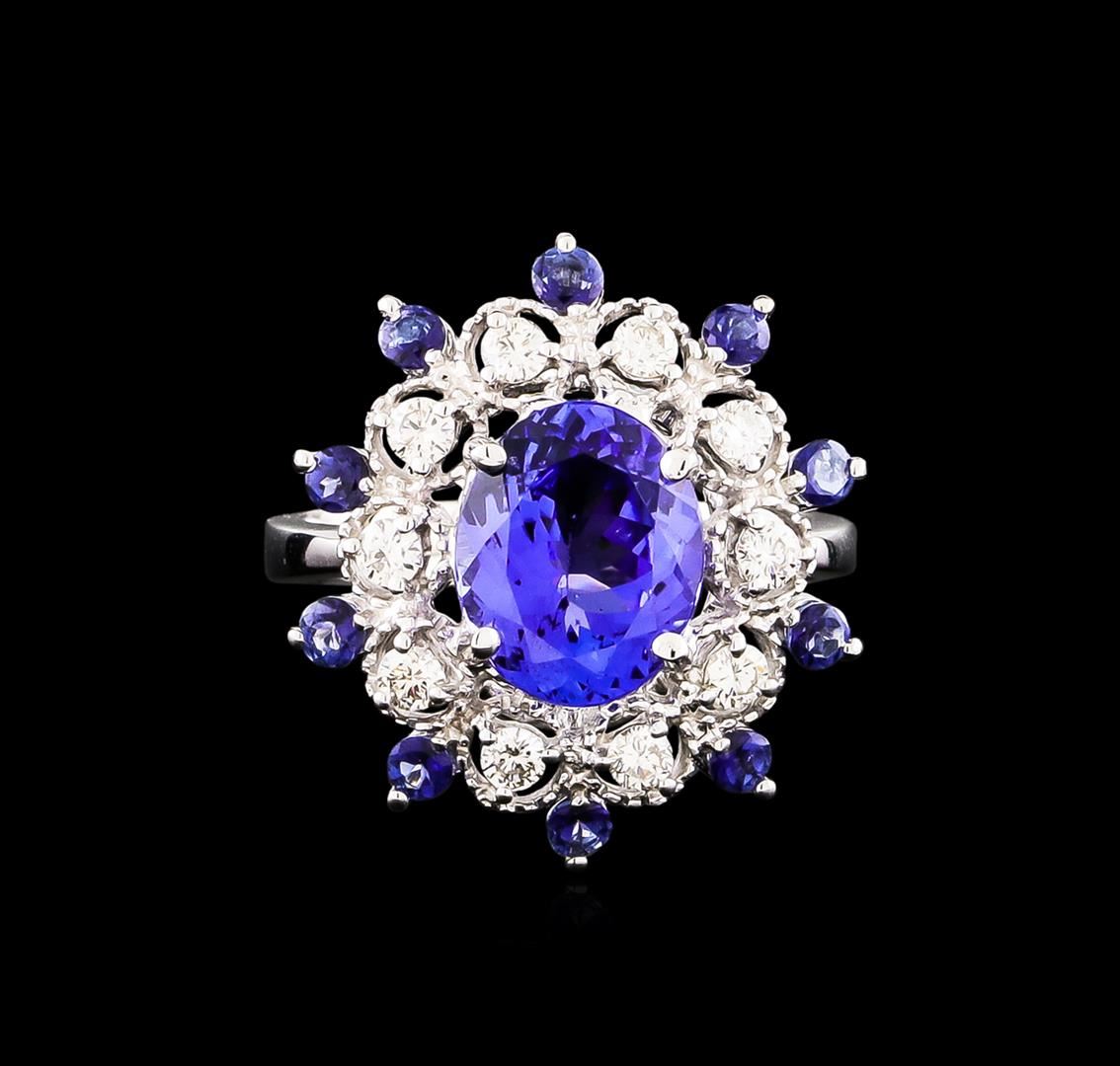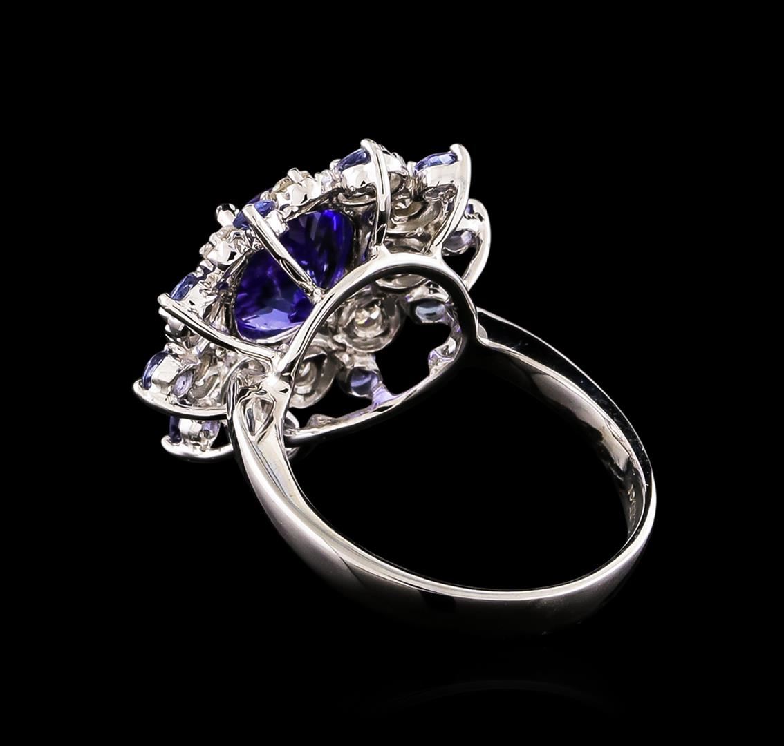 One electronically tested 14KT white gold Ladies combination cast & assembled ring with a bright polish finish. Condition is new. Identified with markings of "14K". Containing: One prong set oval modified brilliant cut natural tanzanite, measuring 10.40 x 8.50 x 4.90mm, approximate weight of 2.93ct., clarity is eye clean, type I, medium light, very slightly grayish, bluish violet color, (GIA bV 4/3), cut is good. Ten prong set round modified brilliant cut natural tanzanites, measuring 2.20 - 2.20 x 1.43 mm, approximate. Total Weight of 0.50ct., clarity is eye clean, type I, medium light, very slightly grayish, bluish violet color, (GIA bV 4/3), cut is very good. Colored gemstones are presumed to have been subjected to commonly used color/clarity enhancement processes. Ten prong set round brilliant cut diamonds, measuring 2.20 - 2.20 x 1.32mm (depth est.) approximate. Total Weight of 10 Stones = 0.39ct. Clarity: SI-2 to I-1. Color: H - I, Cut is Good. All grading of diamonds and colored gemstones in this piece of jewelry are graded in the mounting, unless otherwise stated. Total Weight of Colored Stones 3.43ct. Total Weight of Diamonds 0.39ct. Total Weight of Ring 5.50 grams. GGL Appraised at $7,450.00.