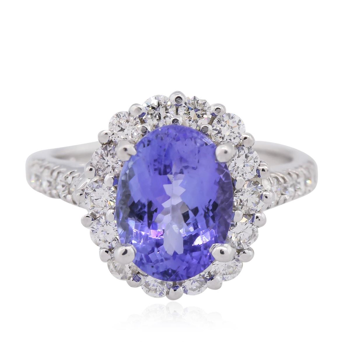 One electronically tested 14KT white gold ladies combination cast & assembled tanzanite and diamond ring with a bright polish finish. Identified with markings of "14K". Condition is new. Containing: One prong set oval modified brilliant cut natural tanzanite, measuring 10.78 x 8.02 x 5.79mm, approximate weight of 3.43ct., clarity is eye clean, type I, medium, moderately strong, violet color, (GIA V 5/4), cut is good. Twenty-Two prong set round brilliant cut diamonds, measuring 2.00 - 2.00 x 1.20mm (depth est.) approximate total weight of 22 Stones = 0.64ct. Clarity: SI-2 to I-1. Color: I - J, Cut is Good. Colored gemstones are presumed to have been subjected to commonly used enhancement processes. All diamonds and colored gemstones are graded in the mounting, unless otherwise stated. Total Weight of Colored Stones 3.43ct. Total Weight of Diamonds 0.64ct. Total Weight of Ring 5.90 grams. GGL Appraised at $6,360.00.