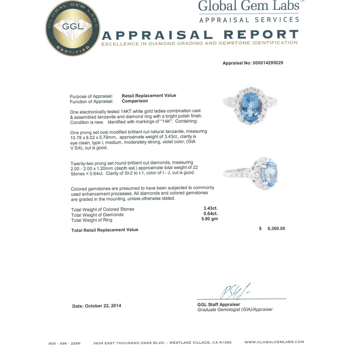 One electronically tested 14KT white gold ladies combination cast & assembled tanzanite and diamond ring with a bright polish finish. Identified with markings of "14K". Condition is new. Containing: One prong set oval modified brilliant cut natural tanzanite, measuring 10.78 x 8.02 x 5.79mm, approximate weight of 3.43ct., clarity is eye clean, type I, medium, moderately strong, violet color, (GIA V 5/4), cut is good. Twenty-Two prong set round brilliant cut diamonds, measuring 2.00 - 2.00 x 1.20mm (depth est.) approximate total weight of 22 Stones = 0.64ct. Clarity: SI-2 to I-1. Color: I - J, Cut is Good. Colored gemstones are presumed to have been subjected to commonly used enhancement processes. All diamonds and colored gemstones are graded in the mounting, unless otherwise stated. Total Weight of Colored Stones 3.43ct. Total Weight of Diamonds 0.64ct. Total Weight of Ring 5.90 grams. GGL Appraised at $6,360.00.