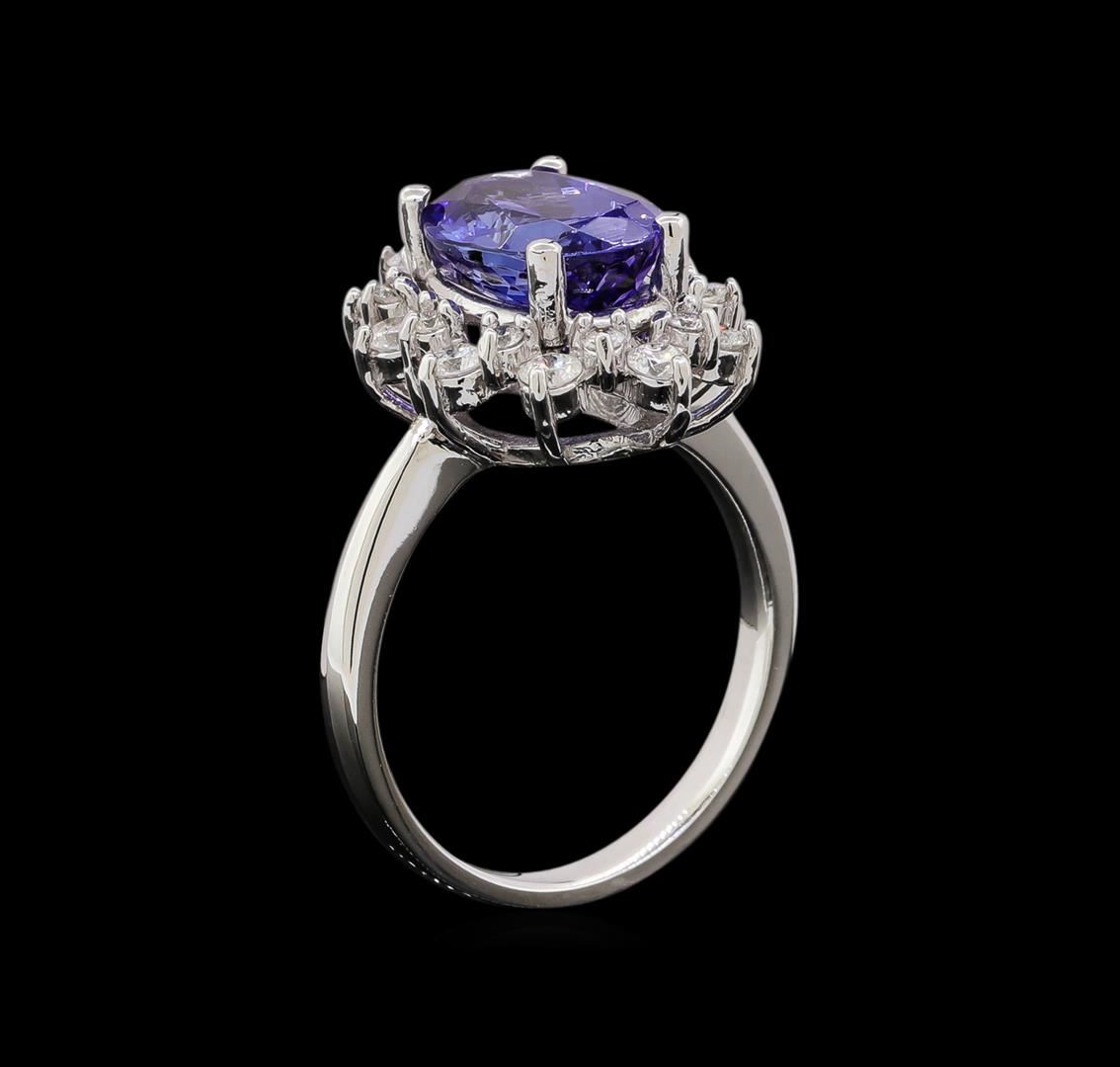 One electronically tested 14KT white gold ladies cast tanzanite and diamond ring with a bright polish finish. Identified with markings of "14K". Condition is new. Containing: One prong set oval modified brilliant cut natural tanzanite, measuring 11.10 x 8.00 x 5.50mm, approximate weight of 3.44ct., clarity is eye clean, type I, medium light, very slightly grayish, violet color, (GIA V 4/3), cut is good. Ten prong set round brilliant cut diamonds, measuring 2.50 - 2.50 x 1.50mm (depth est.) approximate total weight of 10 Stones = 0.57ct. Clarity: SI-1 to SI-2. Color: H - I, Cut is Good. Ten prong set round brilliant cut diamonds, measuring 1.50 - 1.50 x 0.90mm (depth est.) approximate total weight of 10 Stones = 0.12ct. Clarity: SI-1 to SI-2. Color: H - I, Cut is Good. Colored gemstones are presumed to have been subjected to commonly used enhancement processes. All diamonds and colored gemstones are graded in the mounting, unless otherwise stated. Total Weight of Colored Stones 3.44ct. Total Weight of Diamonds 0.69ct. Total Weight of Ring 5.90 grams. GGL Appraised at $4,465.00.
