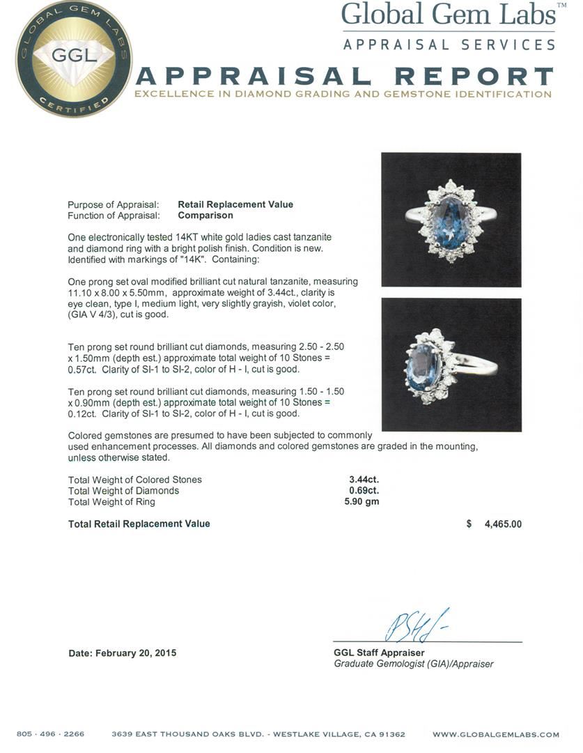One electronically tested 14KT white gold ladies cast tanzanite and diamond ring with a bright polish finish. Identified with markings of "14K". Condition is new. Containing: One prong set oval modified brilliant cut natural tanzanite, measuring 11.10 x 8.00 x 5.50mm, approximate weight of 3.44ct., clarity is eye clean, type I, medium light, very slightly grayish, violet color, (GIA V 4/3), cut is good. Ten prong set round brilliant cut diamonds, measuring 2.50 - 2.50 x 1.50mm (depth est.) approximate total weight of 10 Stones = 0.57ct. Clarity: SI-1 to SI-2. Color: H - I, Cut is Good. Ten prong set round brilliant cut diamonds, measuring 1.50 - 1.50 x 0.90mm (depth est.) approximate total weight of 10 Stones = 0.12ct. Clarity: SI-1 to SI-2. Color: H - I, Cut is Good. Colored gemstones are presumed to have been subjected to commonly used enhancement processes. All diamonds and colored gemstones are graded in the mounting, unless otherwise stated. Total Weight of Colored Stones 3.44ct. Total Weight of Diamonds 0.69ct. Total Weight of Ring 5.90 grams. GGL Appraised at $4,465.00.