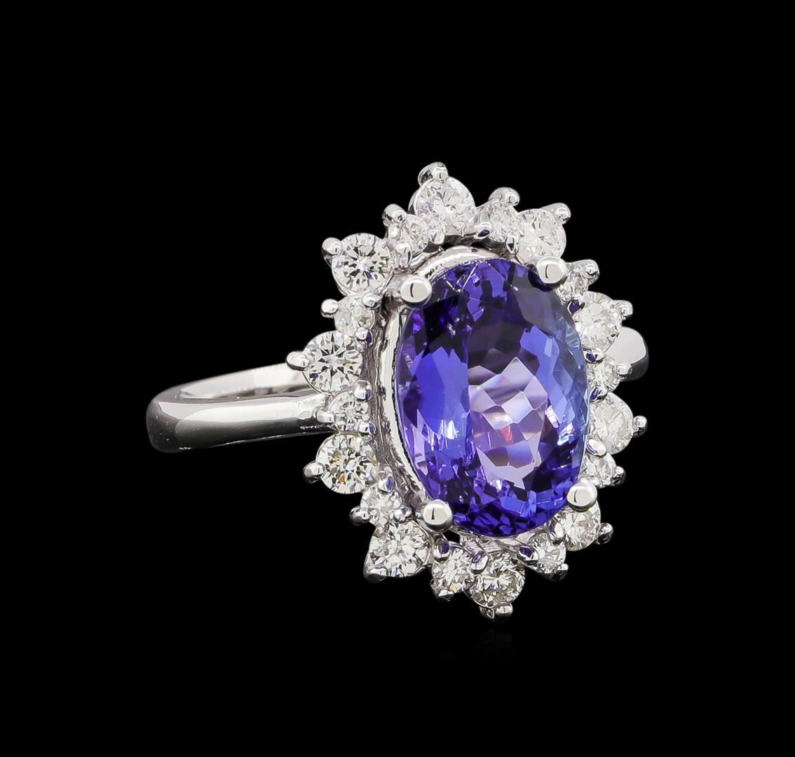 One electronically tested 14KT white gold ladies cast tanzanite and diamond ring with a bright polish finish. Identified with markings of "14K". Condition is new. Containing: One prong set oval modified brilliant cut natural tanzanite, measuring 11.10 x 8.00 x 5.50mm, approximate weight of 3.44ct., clarity is eye clean, type I, medium light, very slightly grayish, violet color, (GIA V 4/3), cut is good. Ten prong set round brilliant cut diamonds, measuring 2.50 - 2.50 x 1.50mm (depth est.) approximate total weight of 10 Stones = 0.57ct. Clarity: SI-1 to SI-2. Color: H - I, Cut is Good. Ten prong set round brilliant cut diamonds, measuring 1.50 - 1.50 x 0.90mm (depth est.) approximate total weight of 10 Stones = 0.12ct. Clarity: SI-1 to SI-2. Color: H - I, Cut is Good. Colored gemstones are presumed to have been subjected to commonly used enhancement processes. All diamonds and colored gemstones are graded in the mounting, unless otherwise stated. Total Weight of Colored Stones 3.44ct. Total Weight of Diamonds 0.69ct. Total Weight of Ring 5.90 grams. GGL Appraised at $4,465.00.