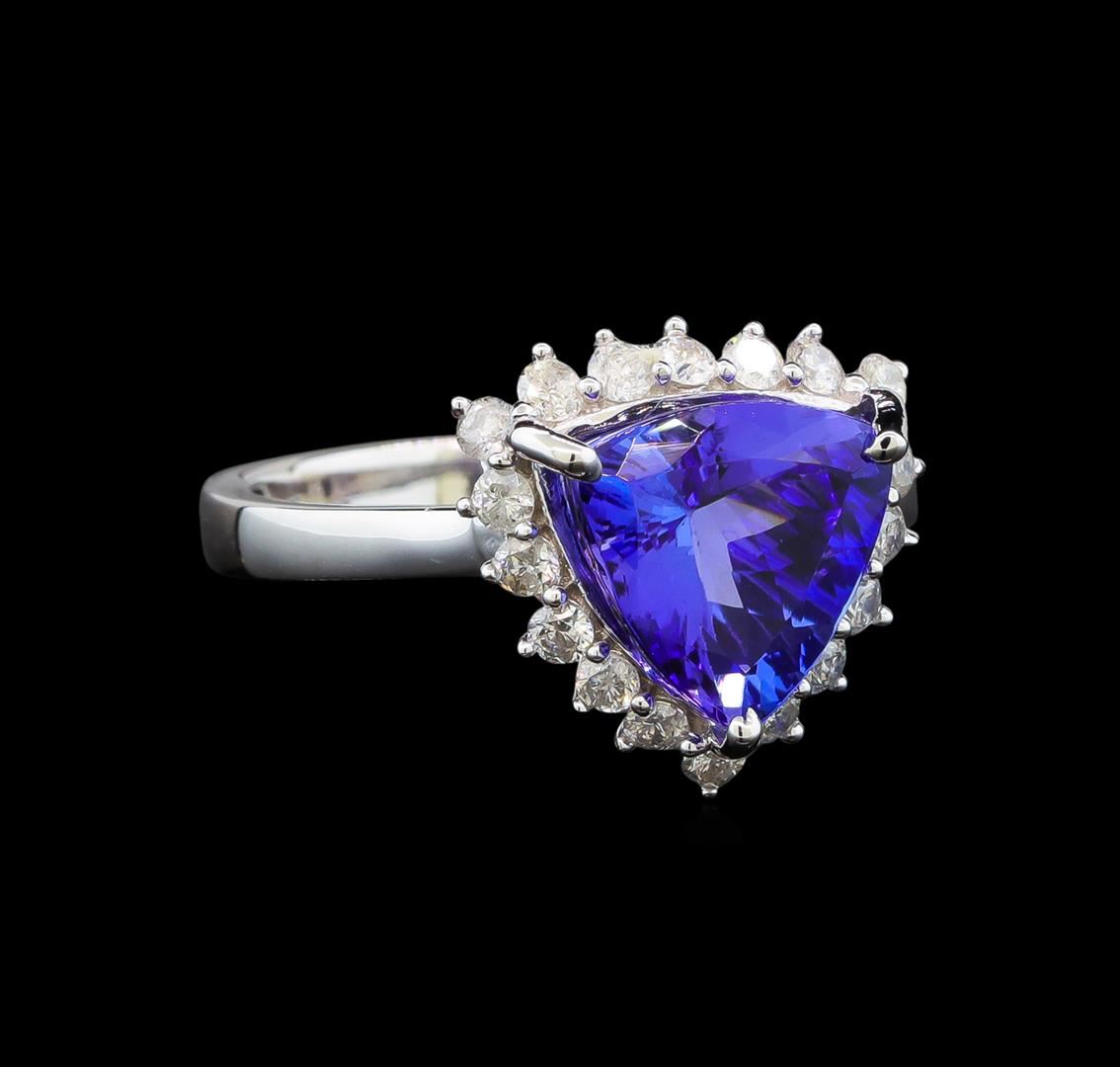 One electronically tested 14KT white gold ladies cast tanzanite and diamond ring with a bright polish finish. Identified with markings of "14K". Condition is new. Containing: One prong set triangle modified brilliant cut natural tanzanite, measuring 10.00 x 10.00 x 5.70mm, approximate weight of 3.44ct., clarity is eye clean, type I, medium light, moderately strong, violet color, (GIA V 4/4), cut is good. Eighteen prong set round brilliant cut diamonds, measuring 1.80 - 1.80 x 1.08mm (depth est.) approximate total weight of 18 Stones = 0.38ct. Clarity: SI-2 to I-2. Color: I - J. Colored gemstones are presumed to have been subjected to commonly used enhancement processes. All diamonds and colored gemstones are graded in the mounting, unless otherwise stated. Total Weight of Colored Stones 3.44ct. Total Weight of Diamonds 0.38ct. Total Weight of Ring 3.60 grams. GGL Appraised at $3,670.00.