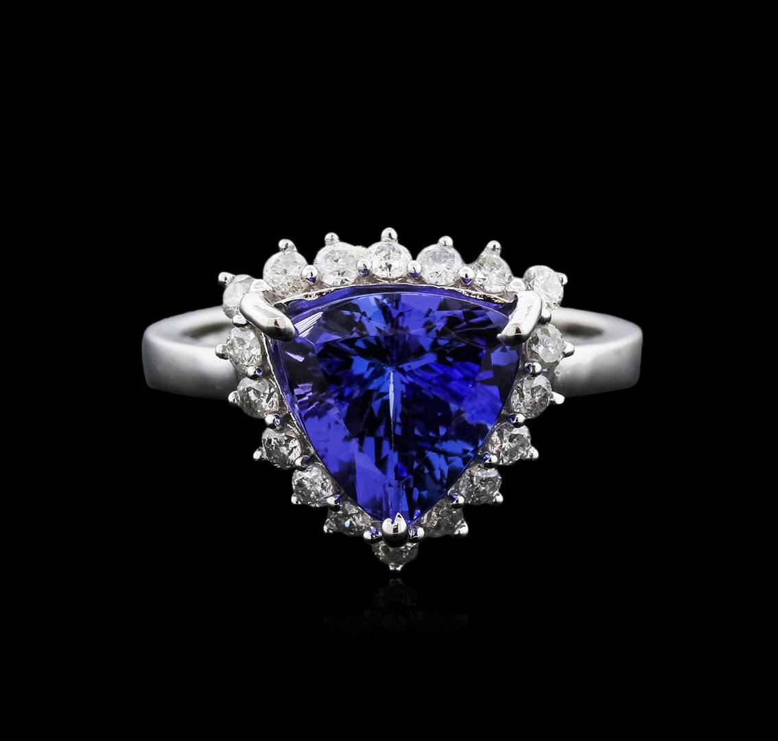 One electronically tested 14KT white gold ladies cast tanzanite and diamond ring with a bright polish finish. Identified with markings of "14K". Condition is new. Containing: One prong set triangle modified brilliant cut natural tanzanite, measuring 10.00 x 10.00 x 5.70mm, approximate weight of 3.44ct., clarity is eye clean, type I, medium light, moderately strong, violet color, (GIA V 4/4), cut is good. Eighteen prong set round brilliant cut diamonds, measuring 1.80 - 1.80 x 1.08mm (depth est.) approximate total weight of 18 Stones = 0.38ct. Clarity: SI-2 to I-2. Color: I - J. Colored gemstones are presumed to have been subjected to commonly used enhancement processes. All diamonds and colored gemstones are graded in the mounting, unless otherwise stated. Total Weight of Colored Stones 3.44ct. Total Weight of Diamonds 0.38ct. Total Weight of Ring 3.60 grams. GGL Appraised at $3,670.00.