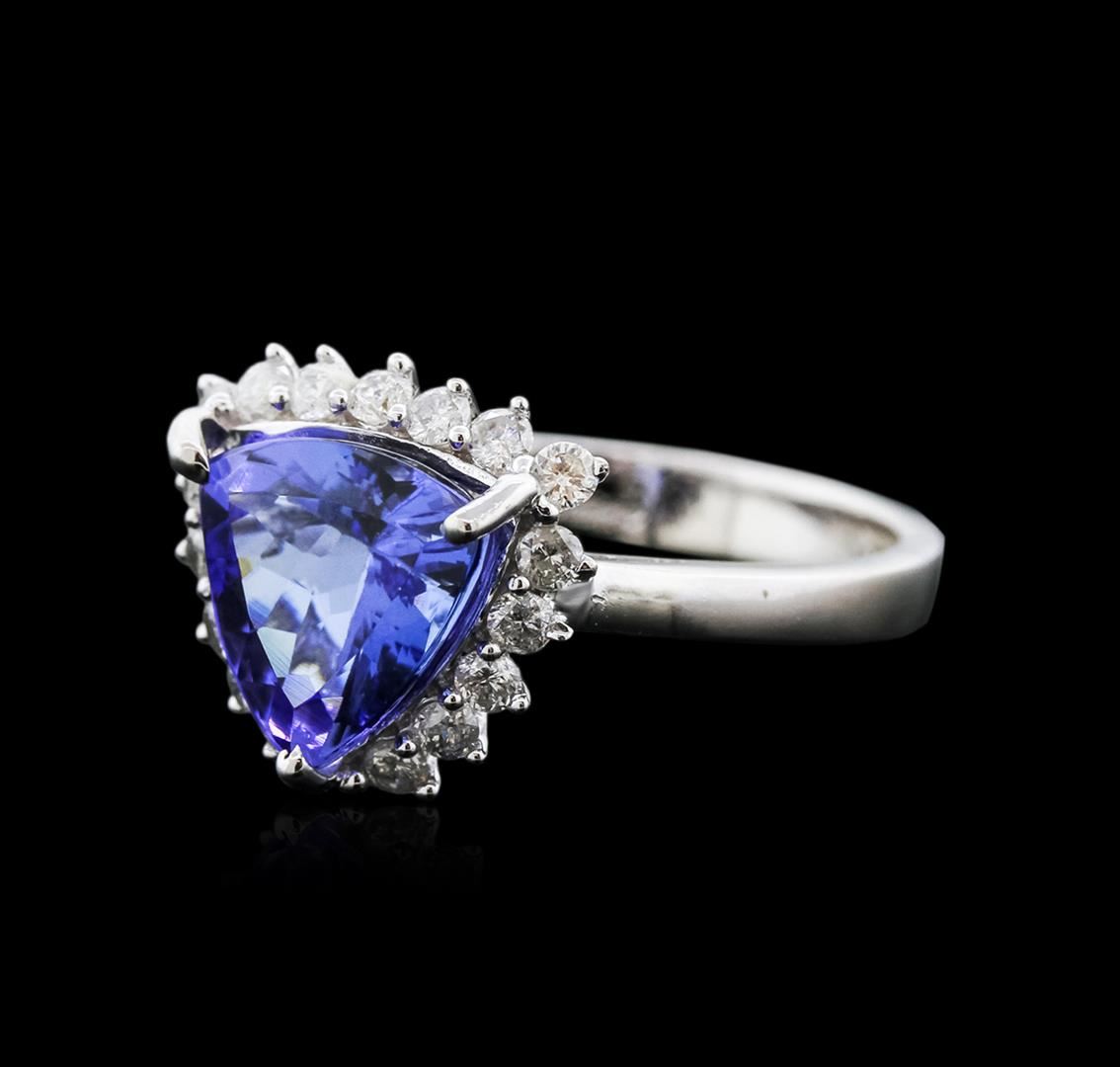 One electronically tested 14KT white gold ladies cast tanzanite and diamond ring with a bright polish finish. Identified with markings of "14K". Condition is new. Containing: One prong set triangle modified brilliant cut natural tanzanite, measuring 10.00 x 10.00 x 5.70mm, approximate weight of 3.44ct., clarity is eye clean, type I, medium light, moderately strong, violet color, (GIA V 4/4), cut is good. Eighteen prong set round brilliant cut diamonds, measuring 1.80 - 1.80 x 1.08mm (depth est.) approximate total weight of 18 Stones = 0.38ct. Clarity: SI-2 to I-2. Color: I - J. Colored gemstones are presumed to have been subjected to commonly used enhancement processes. All diamonds and colored gemstones are graded in the mounting, unless otherwise stated. Total Weight of Colored Stones 3.44ct. Total Weight of Diamonds 0.38ct. Total Weight of Ring 3.60 grams. GGL Appraised at $3,670.00.
