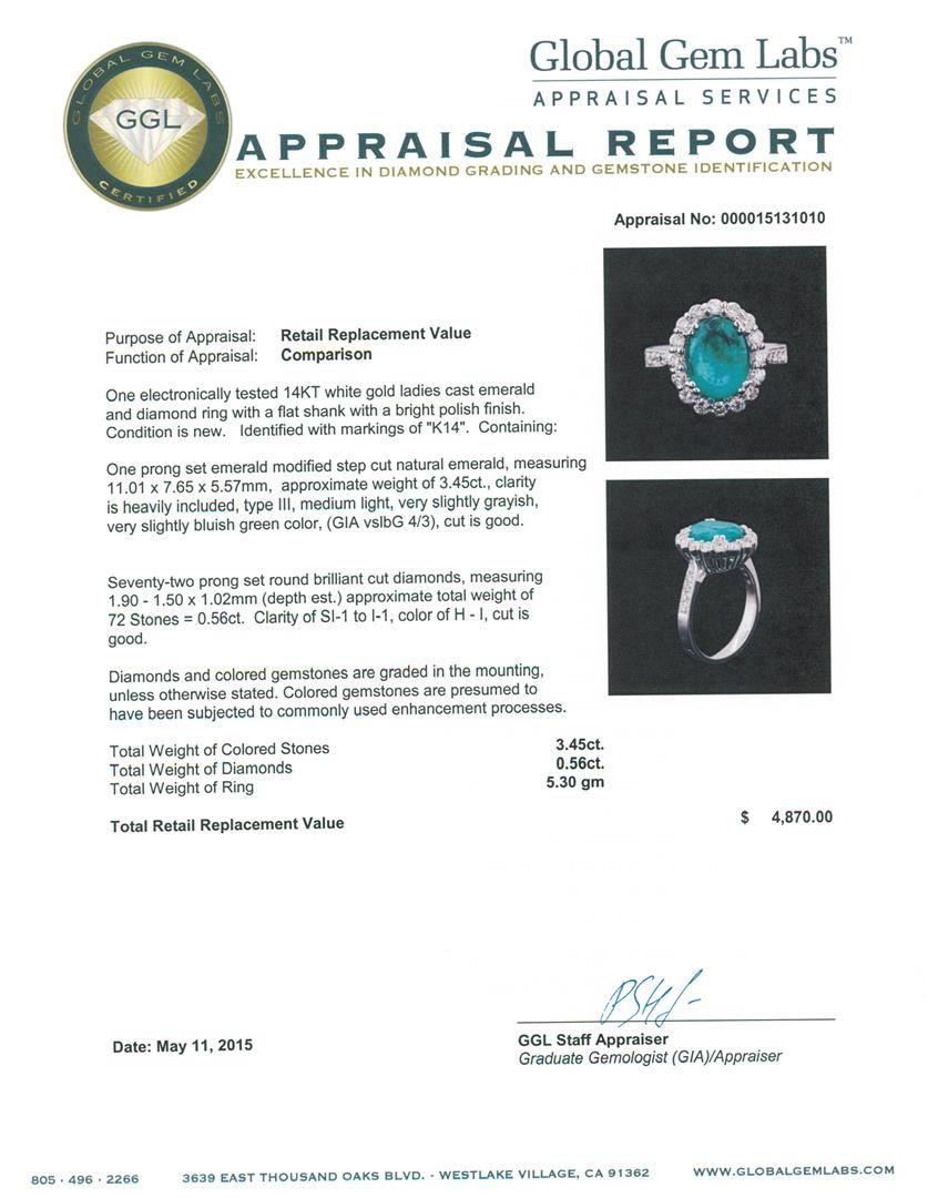 One electronically tested 14KT white gold ladies cast emerald and diamond ring with a flat shank with a bright polish finish. Identified with markings of "K14". Condition is new. Containing: One prong set emerald modified step cut natural emerald, measuri GGL Appraised at $4,870.00.