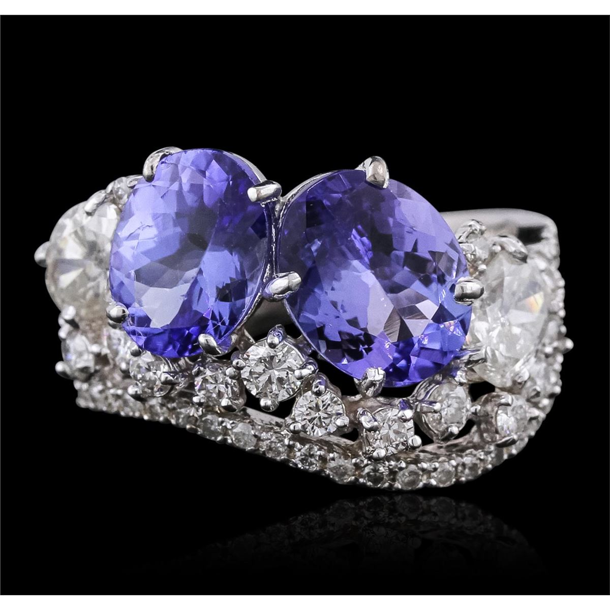 One electronically tested 14KT white gold ladies combination cast & assembled ring with a bright polish finish. Condition is new. Identified with markings of "585". Containing: One prong set oval modified brilliant cut natural tanzanite, measuring 8.50 x 6.30 x 4.00mm, approximate weight of 1.47ct., clarity is eye clean, type I, medium light, very slightly grayish, bluish violet color, (GIA bV 4/3), cut is good. One prong set oval modified brilliant cut natural tanzanite, measuring 9.20 x 7.40 x 4.30mm, approximate weight of 1.98ct., clarity is eye clean, type I, medium light, very slightly grayish, bluish violet color, (GIA bV 4/3), cut is good. Thirty-Nine prong set round brilliant cut diamonds, measuring 1.20 - 1.20 x 0.72mm (depth est.) approximate. Total Weight of 39 Stones = 0.25ct. Clarity: SI-2 to I-2. Color: H - I, Cut is Good. Sixteen prong set round brilliant cut diamonds, measuring 2.00 - 1.70 x 1.11mm (depth est.) approximate. Total Weight of 16 Stones = 0.37ct. Clarity: SI-2. Color: H, Cut is Good. Two prong set oval shaped cut diamonds, measuring 6.50 x 4.20 x 2.90mm (depth est.) approximate. Total Weight of 2 Stones = 1.03ct. Clarity: I-2. Color: I, Cut is Good. Colored gemstones are presumed to have been subjected to commonly used enhancement processes. All diamonds and colored gemstones are graded in the mounting, unless otherwise stated. Total Weight of Colored Stones 3.45ct. Total Weight of Diamonds 1.65ct. Total Weight of Ring 5.70 grams. GGL Appraised at $12,455.00.