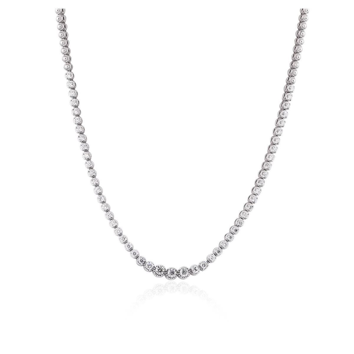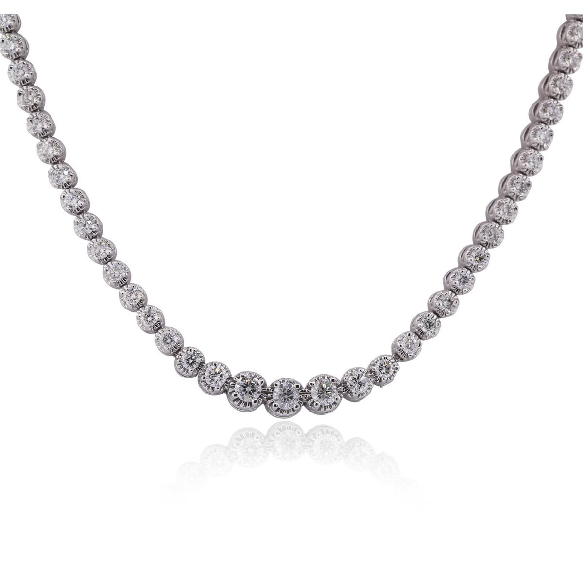 One electronically tested 14KT white gold ladies combination cast & assembled diamond necklace with a hidden box clasp with safety closer with a bright polish finish. Measurements: 16.50 in length. Identified with markings of 14K. Condition is new. Containing: Fifty-Three prong set round brilliant cut diamonds, measuring 3.60 - 2.40 x 1.80mm (depth est.) approximate total weight of 53 Stones = 3.49ct. Clarity: SI-1 to I-2. Color: I - J, Cut is Good. All diamonds are graded in the mounting, unless otherwise stated. Total Weight of Diamonds 3.49ct. Total Weight of Necklace 27.80 grams. GGL Appraised at $12,540.00.