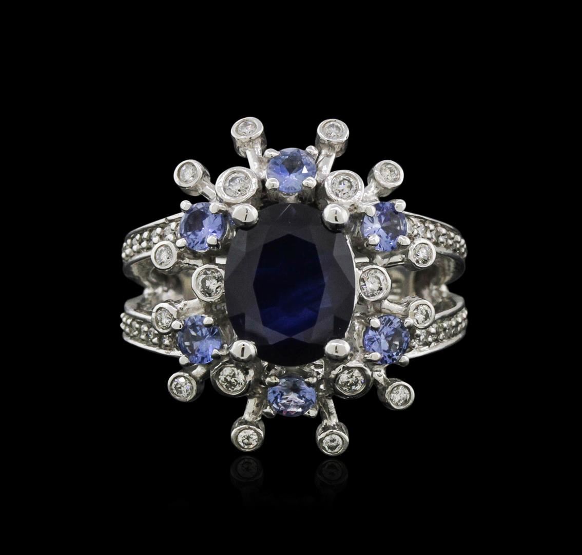 One electronically tested 14KT white gold ladies cast sapphire, tanzanite and diamond ring with a split shoulder shank with a bright polish finish. Identified with markings of "14K". Condition is new. Containing: One prong set oval modified brilliant cut natural blue sapphire, measuring 10.00 x 8.00 x 5.20mm, approximate weight of 3.49ct., clarity is heavily included, type II, medium dark, moderately strong, blue color, (GIA B 6/4), cut is good. Six prong set round modified brilliant cut natural tanzanites, measuring 3.00 - 3.00 x 1.95 mm, approximate total weight of 0.72ct., clarity is eye clean, type I, medium light, moderately strong, violet color, (GIA V 4/4), cut is good. Six bezel set round brilliant cut diamonds, measuring 1.50 - 1.50 x 0.90mm (depth est.) approximate total weight of 6 Stones = 0.07ct. Clarity of SI-1 to I-1, Color of I - J, Cut is Good. Forty prong set round brilliant cut diamonds, measuring 1.20 - 1.20 x 0.72mm (depth est.) approximate total weight of 40 Stones = 0.25ct. Clarity of SI-2 to I-1, Color of I - J, Cut is Good. All diamonds and colored gemstones are graded in the mounting, unless otherwise stated. Colored gemstones are presumed to have been subjected to commonly used enhancement processes. Total Weight of Colored Stones 4.21ct. Total Weight of Diamonds 0.33ct. Total Weight of Ring 10.60 grams. GGL Appraised at $4,725.00.