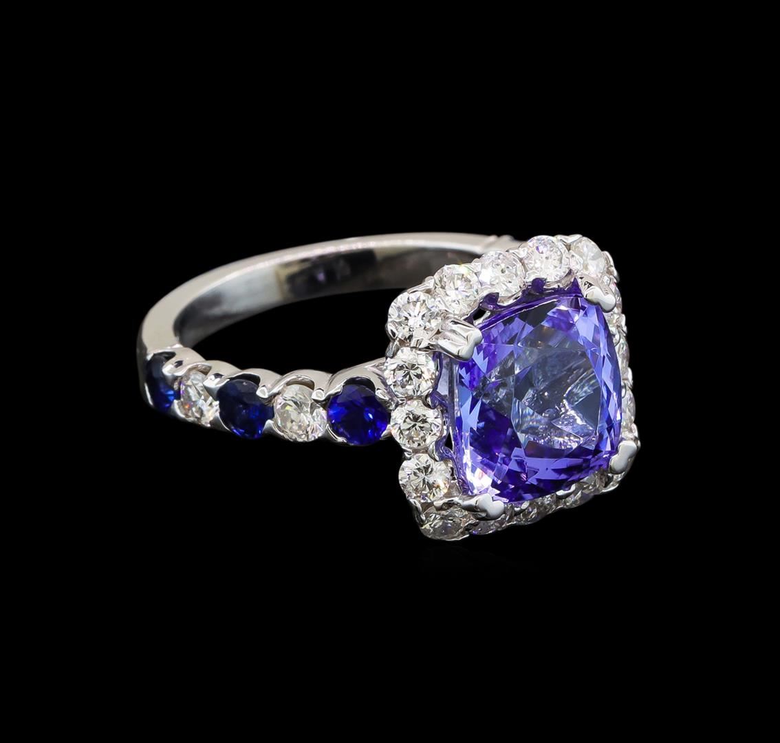 One electronically tested 14KT white gold ladies cast tanzanite, sapphire and diamond ring with a bright polish finish. Identified with markings of "14K". Condition is new. Containing: One prong set square cushion modified mixed cut natural tanzanite, measuring 8.80 x 8.80 x 5.72mm, approximate weight of 3.49ct., clarity is eye clean, type I, medium light, slightly grayish, violet color, (GIA V 4/2), cut is good. Six prong set round modified brilliant cut natural blue sapphires, measuring 3.00 - 3.00 x 1.95 mm, approximate total weight of 0.84ct., clarity is slightly included, type II, medium, very slightly grayish, blue color, (GIA B 5/3), cut is good. Twenty prong set round brilliant cut diamonds, measuring 2.50 - 2.00 x 1.35mm (depth est.) approximate total weight of 20 Stones = 0.83ct. Clarity: SI-1 to I-1. Color: J, Cut is Good. Colored gemstones are presumed to have been subjected to commonly used enhancement processes. All diamonds and colored gemstones are graded in the mounting, unless otherwise stated. Total Weight of Colored Stones 4.33ct. Total Weight of Diamonds 0.83ct. Total Weight of Ring 5.60 grams. GGL Appraised at $4,740.00.