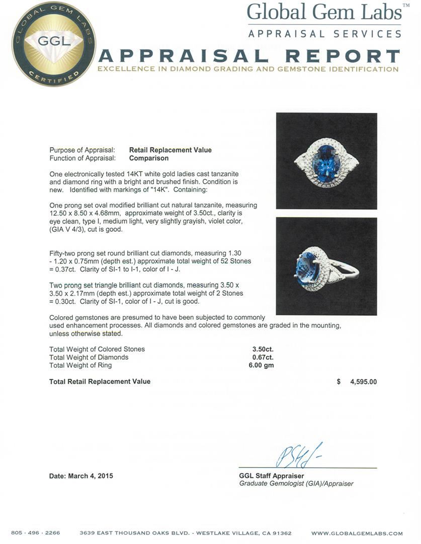 One electronically tested 14KT white gold ladies cast tanzanite and diamond ring with a bright and brushed finish. Identified with markings of "14K". Condition is new. Containing: One prong set oval modified brilliant cut natural tanzanite, measuring 12.50 x 8.50 x 4.68mm, approximate weight of 3.50ct., clarity is eye clean, type I, medium light, very slightly grayish, violet color, (GIA V 4/3), cut is good. Fifty-Two prong set round brilliant cut diamonds, measuring 1.30 - 1.20 x 0.75mm (depth est.) approximate total weight of 52 Stones = 0.37ct. Clarity: SI-1 to I-1. Color: I - J. Two prong set triangle brilliant cut diamonds, measuring 3.50 x 3.50 x 2.17mm (depth est.) approximate total weight of 2 Stones = 0.30ct. Clarity: SI-1. Color: I - J, Cut is Good. Colored gemstones are presumed to have been subjected to commonly used enhancement processes. All diamonds and colored gemstones are graded in the mounting, unless otherwise stated. Total Weight of Colored Stones 3.50ct. Total Weight of Diamonds 0.67ct. Total Weight of Ring 6.00. grams. GGL Appraised at $4,595.00.