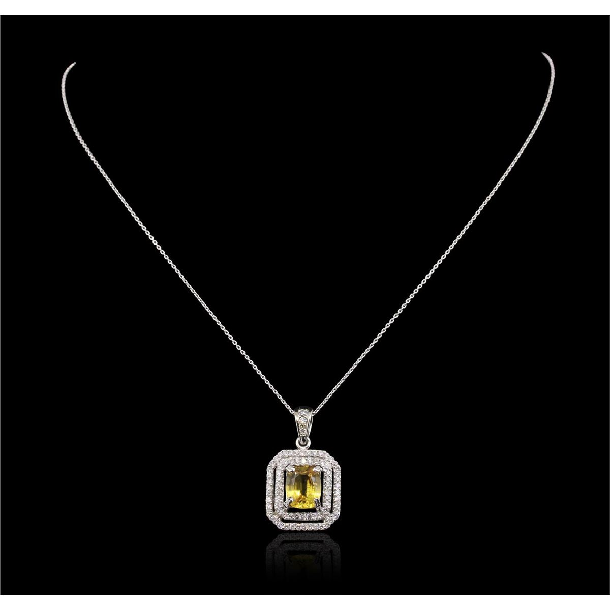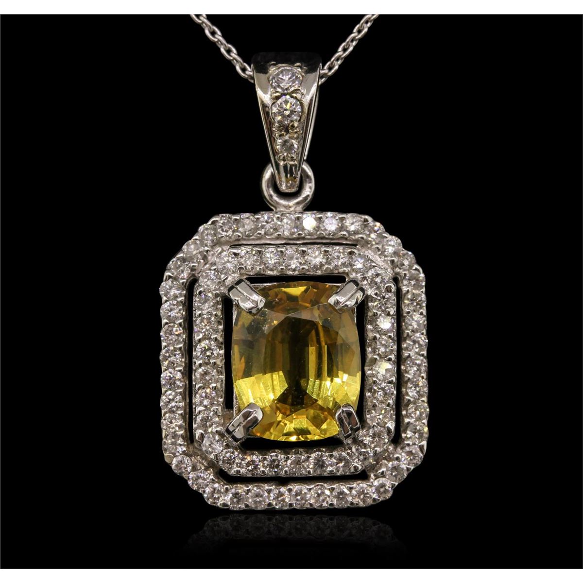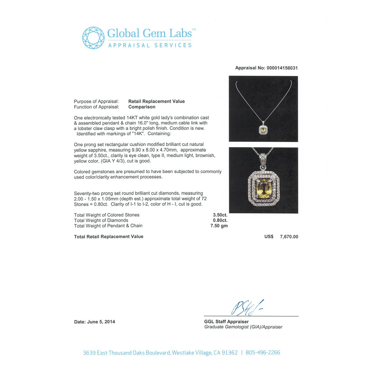 One electronically tested 14KT white gold Ladies combination cast & assembled pendant & chain 16.0" long, medium cable link with a lobster claw clasp with a bright polish finish. Condition is new. Identified with markings of "14K". Containing: One prong set rectangular cushion modified brilliant cut natural yellow sapphire, measuring 9.90 x 8.00 x 4.70mm, approximate weight of 3.50ct., clarity is eye clean, type II, medium light, brownish, yellow color, (GIA Y 4/3), cut is good. Colored gemstones are presumed to have been subjected to commonly used color/clarity enhancement processes. Seventy-Two prong set round brilliant cut diamonds, measuring 2.00 - 1.50 x 1.05mm (depth est.) approximate. Total Weight of 72 Stones = 0.80ct. Clarity: I-1 to I-2. Color: H - I, Cut is Good. Total Weight of Colored Stones 3.50ct. Total Weight of Diamonds 0.80ct. Total Weight of Pendant & Chain 7.50 grams. GGL Appraised at $7,670.00.
