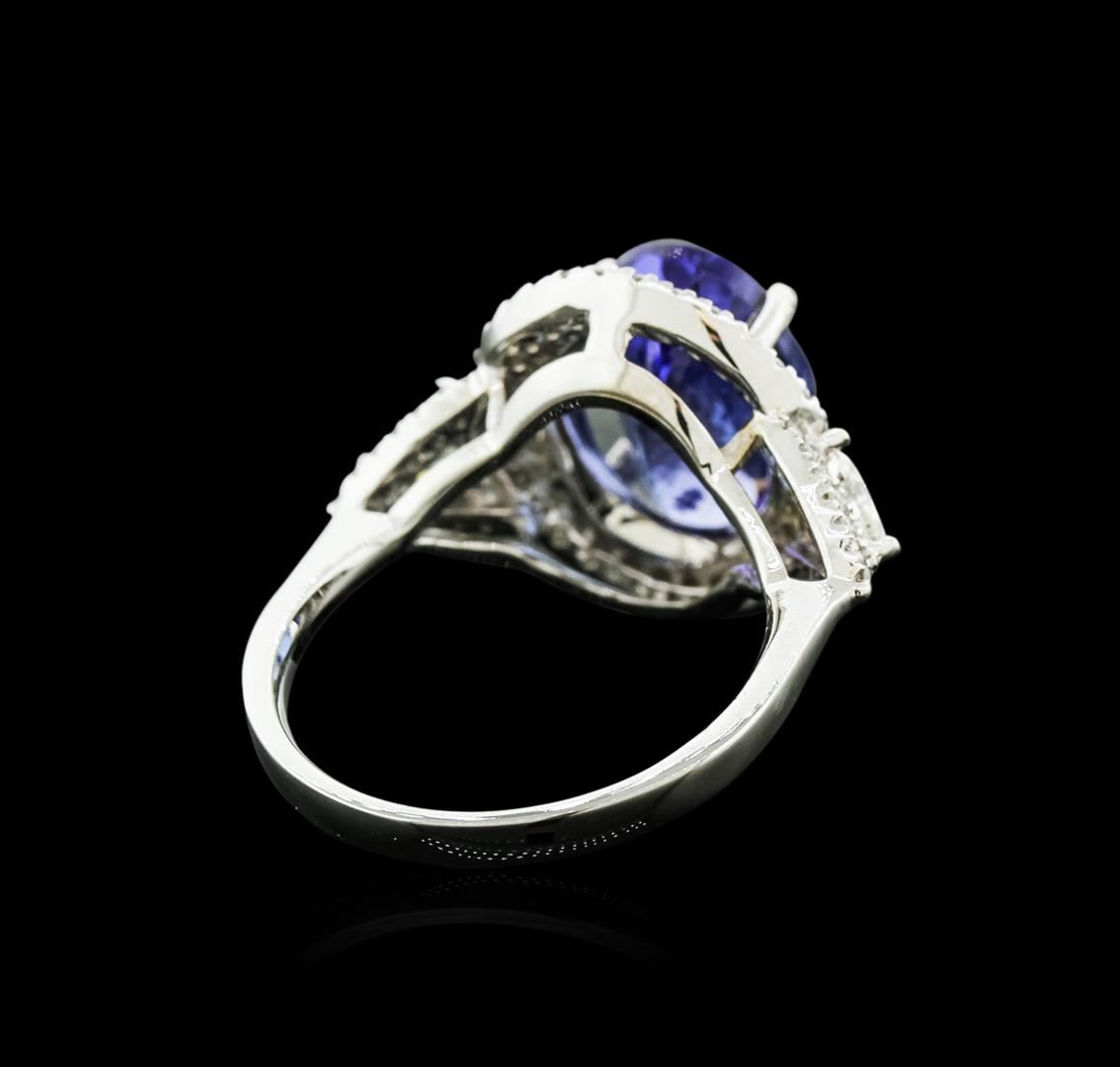 One electronically tested 14KT white gold ladies cast tanzanite and diamond ring with a bright and brushed finish. Identified with markings of "14K". Condition is new. Containing: One prong set oval modified brilliant cut natural tanzanite, measuring 12.50 x 8.50 x 4.68mm, approximate weight of 3.50ct., clarity is eye clean, type I, medium light, very slightly grayish, violet color, (GIA V 4/3), cut is good. Fifty-Two prong set round brilliant cut diamonds, measuring 1.30 - 1.20 x 0.75mm (depth est.) approximate total weight of 52 Stones = 0.37ct. Clarity: SI-1 to I-1. Color: I - J. Two prong set triangle brilliant cut diamonds, measuring 3.50 x 3.50 x 2.17mm (depth est.) approximate total weight of 2 Stones = 0.30ct. Clarity: SI-1. Color: I - J, Cut is Good. Colored gemstones are presumed to have been subjected to commonly used enhancement processes. All diamonds and colored gemstones are graded in the mounting, unless otherwise stated. Total Weight of Colored Stones 3.50ct. Total Weight of Diamonds 0.67ct. Total Weight of Ring 6.00. grams. GGL Appraised at $4,595.00.