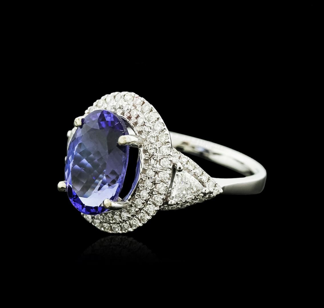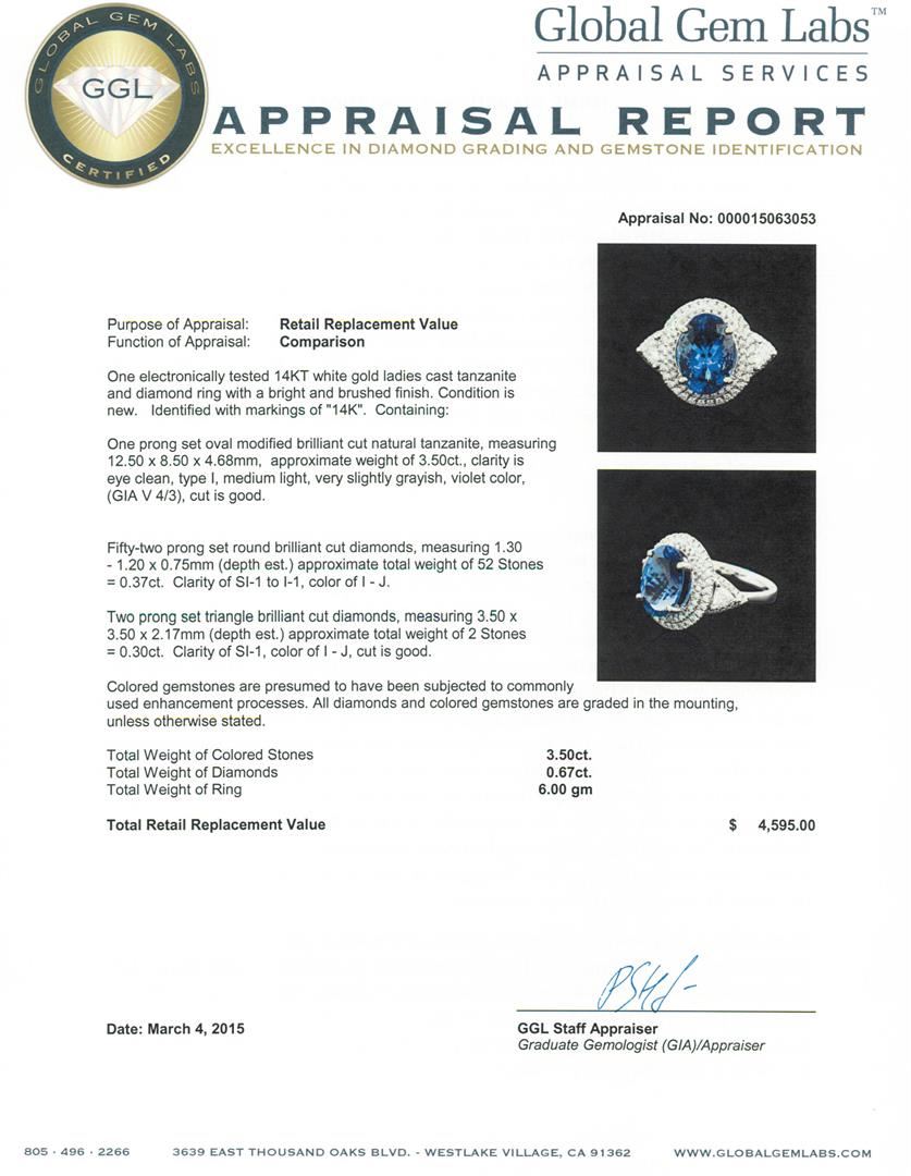 One electronically tested 14KT white gold ladies cast tanzanite and diamond ring with a bright and brushed finish. Identified with markings of "14K". Condition is new. Containing: One prong set oval modified brilliant cut natural tanzanite, measuring 12.50 x 8.50 x 4.68mm, approximate weight of 3.50ct., clarity is eye clean, type I, medium light, very slightly grayish, violet color, (GIA V 4/3), cut is good. Fifty-Two prong set round brilliant cut diamonds, measuring 1.30 - 1.20 x 0.75mm (depth est.) approximate total weight of 52 Stones = 0.37ct. Clarity: SI-1 to I-1. Color: I - J. Two prong set triangle brilliant cut diamonds, measuring 3.50 x 3.50 x 2.17mm (depth est.) approximate total weight of 2 Stones = 0.30ct. Clarity: SI-1. Color: I - J, Cut is Good. Colored gemstones are presumed to have been subjected to commonly used enhancement processes. All diamonds and colored gemstones are graded in the mounting, unless otherwise stated. Total Weight of Colored Stones 3.50ct. Total Weight of Diamonds 0.67ct. Total Weight of Ring 6.00. grams. GGL Appraised at $4,595.00.