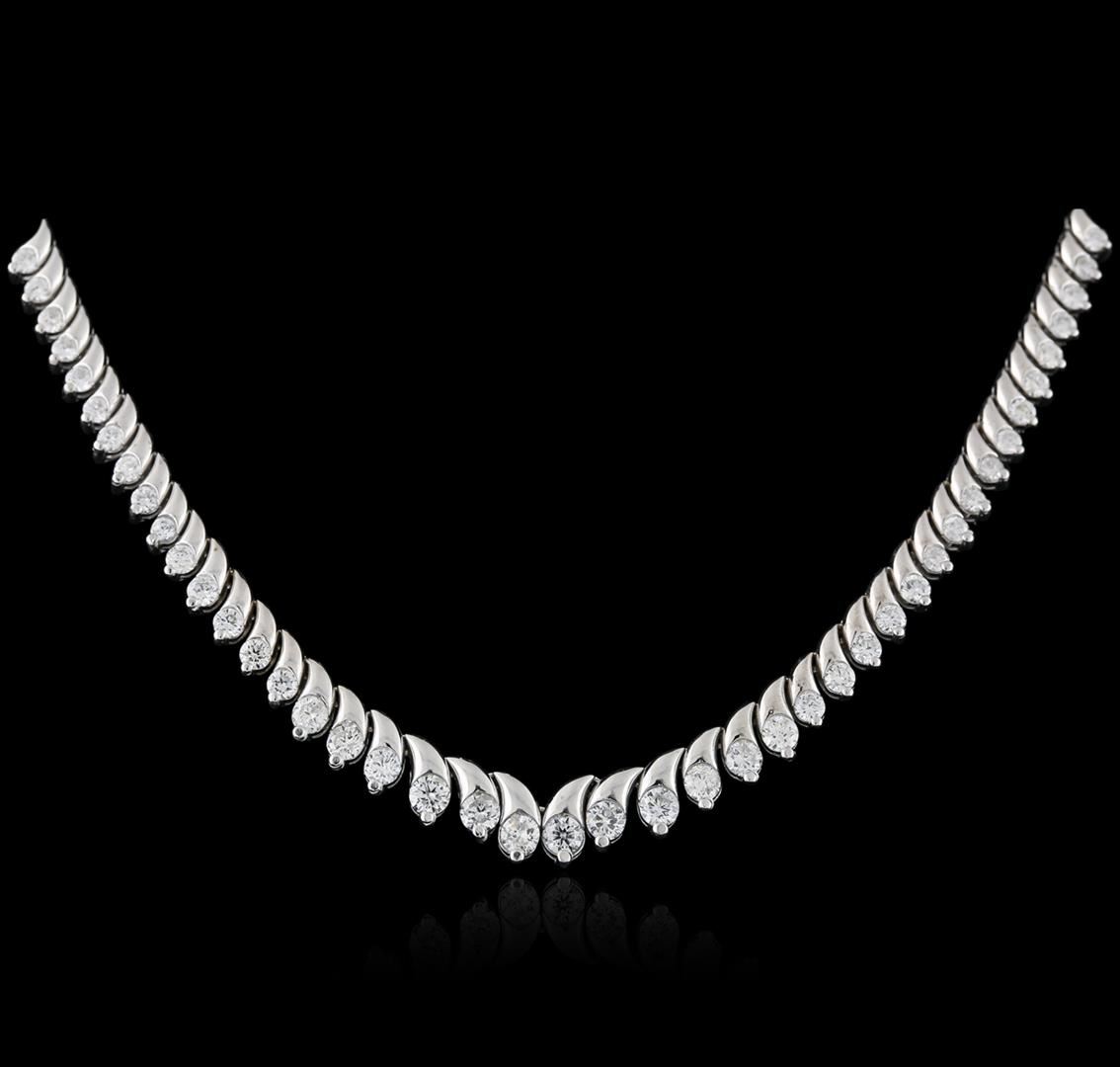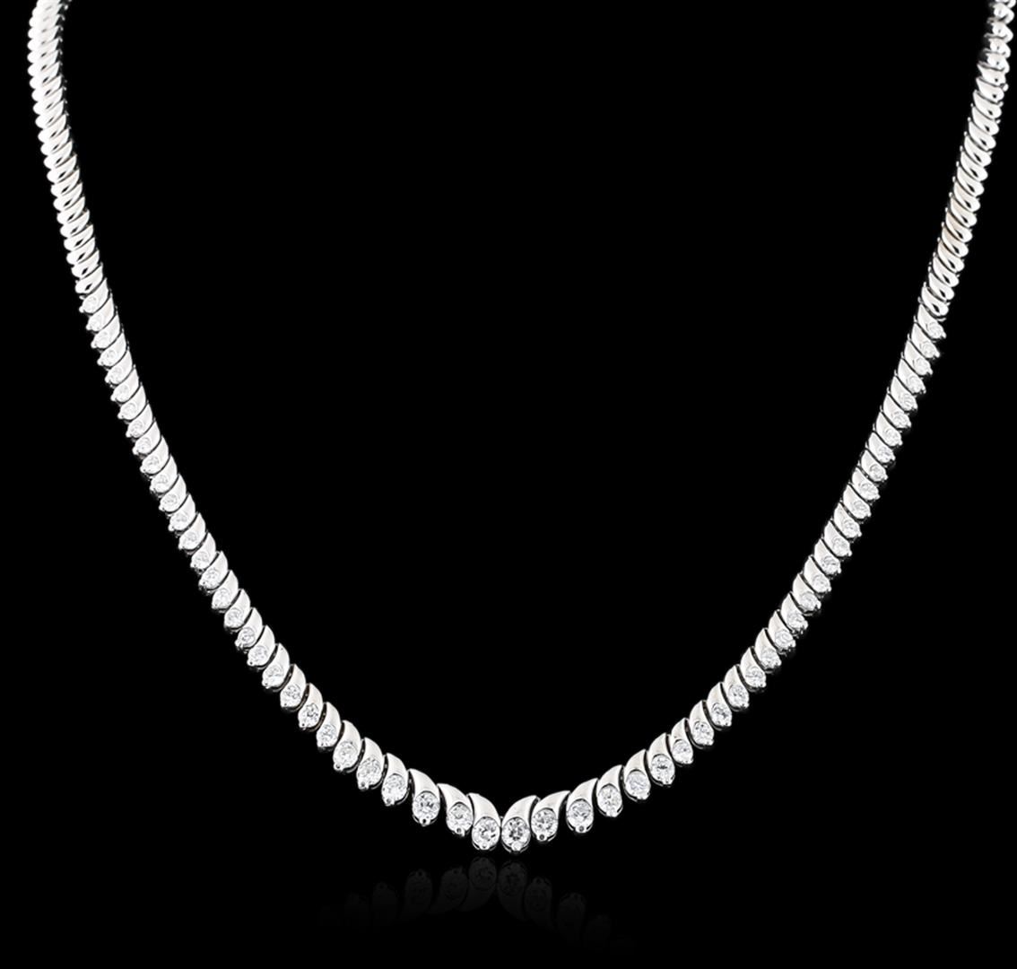 One electronically tested 14KT white gold ladies cast diamond necklace with a hidden box clasp with safety closer with a bright polish finish. Measurements: 17" in length Identified with markings of "14K". Condition is new. Containing: Sixty prong set round brilliant cut diamonds, measuring 3.50 - 2.00 x 1.65mm (depth est.) approximate total weight of 60 Stones = 3.52ct. Clarity: SI-1 to I-1. Color: H - I, Cut is Good. All diamonds are graded in the mounting, unless otherwise stated. Total Weight of Diamonds 3.52ct. Total Weight of Necklace 28.86 grams. GGL Appraised at $11,120.00.