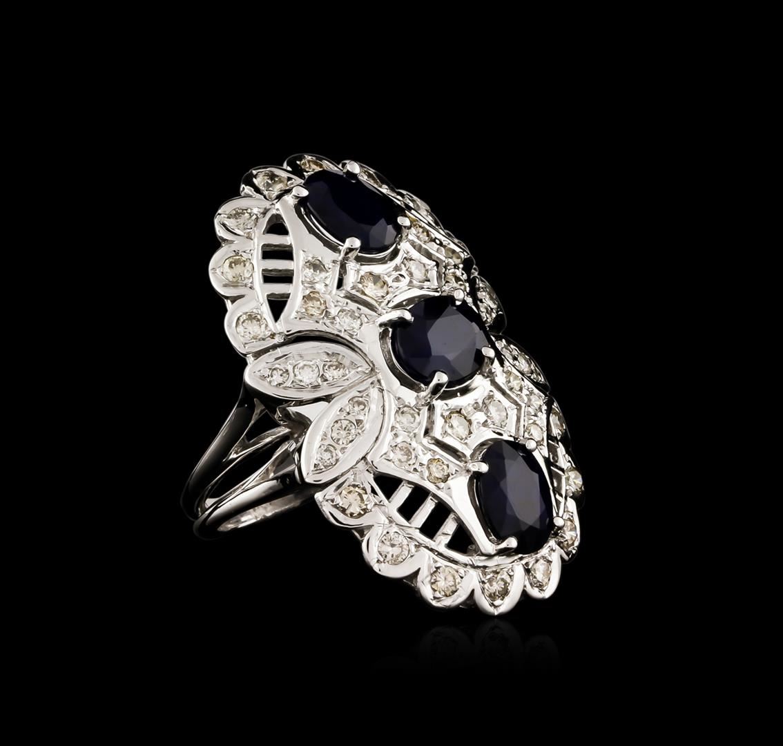 One electronically tested 14KT white gold ladies cast sapphire and diamond ring with a bright polish finish. Identified with markings of "14K". Condition is new. Containing: Three prong set oval modified brilliant cut natural blue sapphires, measuring 8.00 x 6.50 x 2.71mm, approximate total weight of 3.54ct., clarity is heavily included, type II, medium dark, strong, blue color, (GIA B 6/5), cut is good. Forty-Two prong set round brilliant cut diamonds, measuring 1.90 - 1.90 x 1.14mm (depth est.) approximate total weight of 42 Stones = 1.05ct. Clarity: SI-1 to SI-2. Color: J, Cut is Good. Colored gemstones are presumed to have been subjected to commonly used enhancement processes, All diamonds and colored gemstones are graded in the mounting, unless otherwise stated. Total Weight of Colored Stones 3.54ct. Total Weight of Diamonds 1.05ct. Total Weight of Ring 12.70 grams. GGL Appraised.