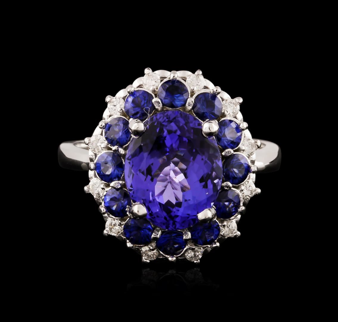 One electronically tested 14KT white gold ladies cast tanzanite, sapphire and diamond ring with a bright polish finish. Identified with markings of "14K". Condition is new. Containing: One prong set oval modified brilliant cut natural tanzanite, measuring 10.04 x 8.83 x 5.68mm, approximate weight of 3.54ct., clarity is eye clean, type I, medium light, very slightly grayish, bluish violet color, (GIA bV 4/3), cut is good. Twelve prong set round modified brilliant cut natural blue sapphires, measuring 2.90 - 2.90 x 1.89 mm, approximate total weight of 1.56ct., clarity is slightly included, type II, medium, moderately strong, blue color, (GIA B 5/4), cut is good. Twelve prong set round brilliant cut diamonds, measuring 2.00 - 2.00 x 1.20mm (depth est.) approximate total weight of 12 Stones = 0.35ct. Clarity: SI-1 to SI-2. Color: H - I, Cut is Good. Colored gemstones are presumed to have been subjected to commonly used enhancement processes. All diamonds and colored gemstones are graded in the mounting, unless otherwise stated. Total Weight of Colored Stones 5.10ct. Total Weight of Diamonds 0.35ct. Total Weight of Ring 7.00 grams. GGL Appraised at $4,430.00.