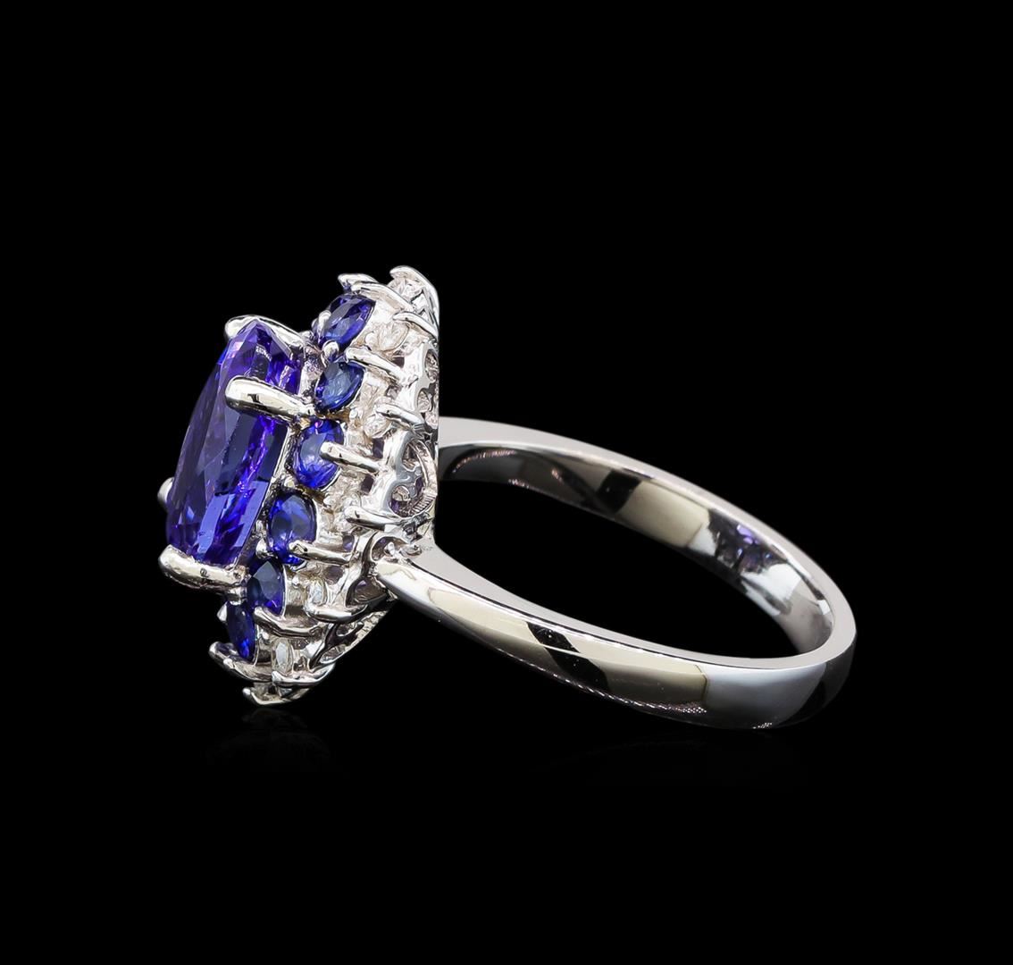 One electronically tested 14KT white gold ladies cast tanzanite, sapphire and diamond ring with a bright polish finish. Identified with markings of "14K". Condition is new. Containing: One prong set oval modified brilliant cut natural tanzanite, measuring 10.04 x 8.83 x 5.68mm, approximate weight of 3.54ct., clarity is eye clean, type I, medium light, very slightly grayish, bluish violet color, (GIA bV 4/3), cut is good. Twelve prong set round modified brilliant cut natural blue sapphires, measuring 2.90 - 2.90 x 1.89 mm, approximate total weight of 1.56ct., clarity is slightly included, type II, medium, moderately strong, blue color, (GIA B 5/4), cut is good. Twelve prong set round brilliant cut diamonds, measuring 2.00 - 2.00 x 1.20mm (depth est.) approximate total weight of 12 Stones = 0.35ct. Clarity: SI-1 to SI-2. Color: H - I, Cut is Good. Colored gemstones are presumed to have been subjected to commonly used enhancement processes. All diamonds and colored gemstones are graded in the mounting, unless otherwise stated. Total Weight of Colored Stones 5.10ct. Total Weight of Diamonds 0.35ct. Total Weight of Ring 7.00 grams. GGL Appraised at $4,430.00.
