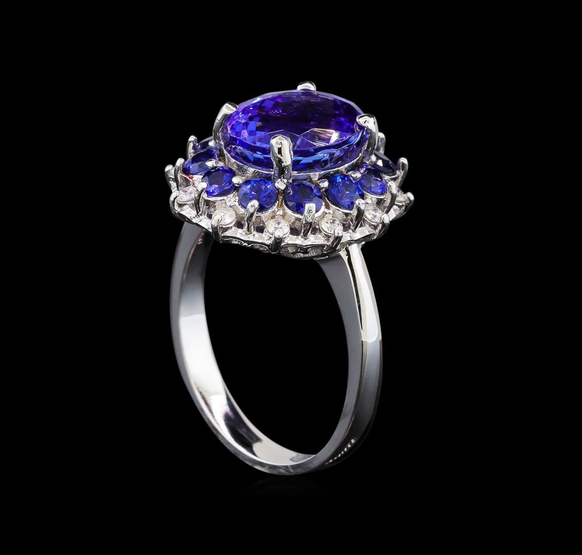 One electronically tested 14KT white gold ladies cast tanzanite, sapphire and diamond ring with a bright polish finish. Identified with markings of "14K". Condition is new. Containing: One prong set oval modified brilliant cut natural tanzanite, measuring 10.04 x 8.83 x 5.68mm, approximate weight of 3.54ct., clarity is eye clean, type I, medium light, very slightly grayish, bluish violet color, (GIA bV 4/3), cut is good. Twelve prong set round modified brilliant cut natural blue sapphires, measuring 2.90 - 2.90 x 1.89 mm, approximate total weight of 1.56ct., clarity is slightly included, type II, medium, moderately strong, blue color, (GIA B 5/4), cut is good. Twelve prong set round brilliant cut diamonds, measuring 2.00 - 2.00 x 1.20mm (depth est.) approximate total weight of 12 Stones = 0.35ct. Clarity: SI-1 to SI-2. Color: H - I, Cut is Good. Colored gemstones are presumed to have been subjected to commonly used enhancement processes. All diamonds and colored gemstones are graded in the mounting, unless otherwise stated. Total Weight of Colored Stones 5.10ct. Total Weight of Diamonds 0.35ct. Total Weight of Ring 7.00 grams. GGL Appraised at $4,430.00.