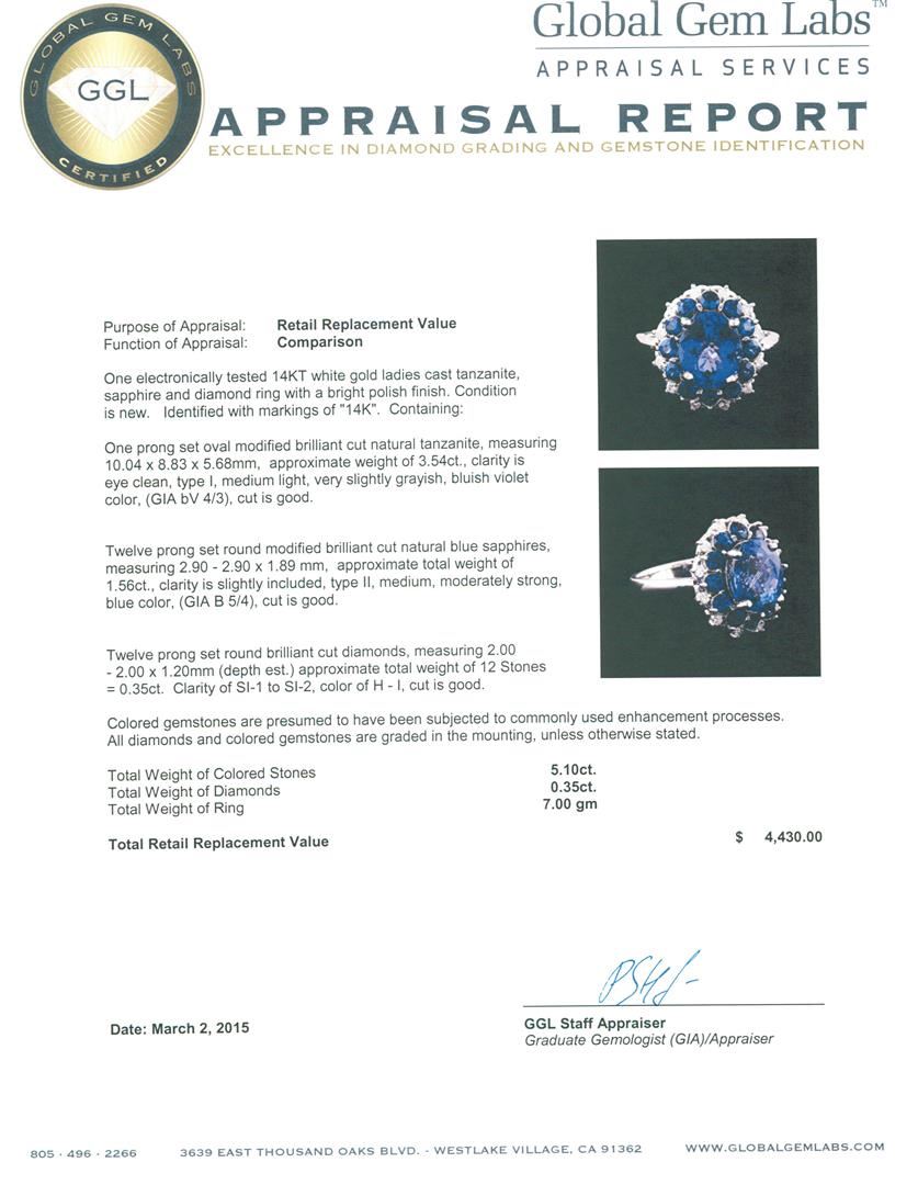 One electronically tested 14KT white gold ladies cast tanzanite, sapphire and diamond ring with a bright polish finish. Identified with markings of "14K". Condition is new. Containing: One prong set oval modified brilliant cut natural tanzanite, measuring 10.04 x 8.83 x 5.68mm, approximate weight of 3.54ct., clarity is eye clean, type I, medium light, very slightly grayish, bluish violet color, (GIA bV 4/3), cut is good. Twelve prong set round modified brilliant cut natural blue sapphires, measuring 2.90 - 2.90 x 1.89 mm, approximate total weight of 1.56ct., clarity is slightly included, type II, medium, moderately strong, blue color, (GIA B 5/4), cut is good. Twelve prong set round brilliant cut diamonds, measuring 2.00 - 2.00 x 1.20mm (depth est.) approximate total weight of 12 Stones = 0.35ct. Clarity: SI-1 to SI-2. Color: H - I, Cut is Good. Colored gemstones are presumed to have been subjected to commonly used enhancement processes. All diamonds and colored gemstones are graded in the mounting, unless otherwise stated. Total Weight of Colored Stones 5.10ct. Total Weight of Diamonds 0.35ct. Total Weight of Ring 7.00 grams. GGL Appraised at $4,430.00.
