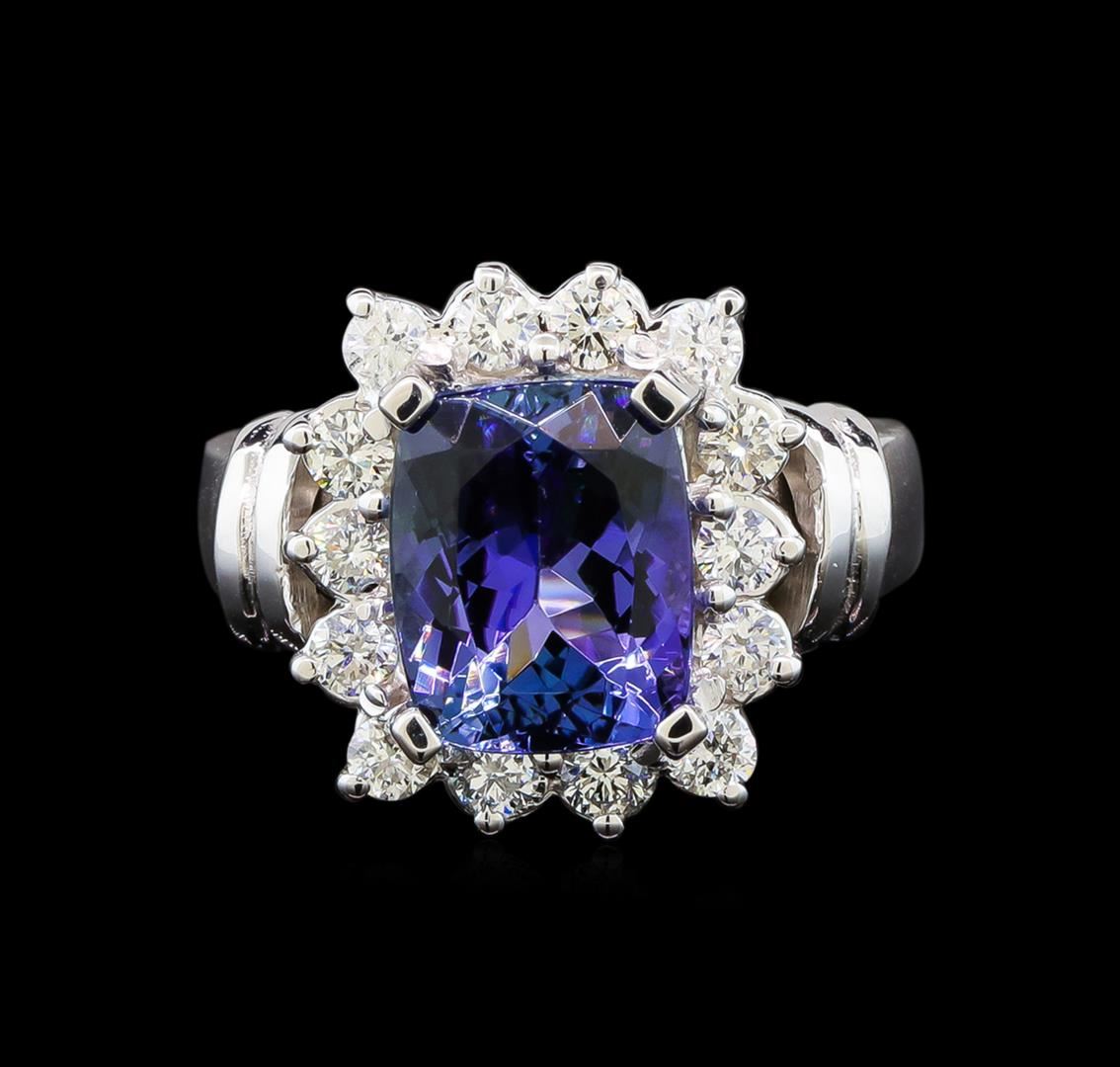 One electronically tested 14KT white gold ladies cast tanzanite and diamond ring with a bright polish finish. Condition is new. Containing: One prong set rectangular cushion modified brilliant cut natural tanzanite, measuring 10.18 x 8.23 x 5.36mm, approximate weight of 3.54ct., clarity is eye clean, type I, medium light, very slightly grayish, violet color, (GIA V 4/3), cut is good. Fourteen prong set round brilliant cut diamonds, measuring 2.40 - 2.40 x 1.44mm (depth est.) approximate total weight of 14 Stones = 0.71ct. Clarity: SI-1 to SI-2. Color: J - K, Cut is Good. Colored gemstones are presumed to have been subjected to commonly used enhancement processes. All diamonds and colored gemstones are graded in the mounting, unless otherwise stated. Total Weight of Colored Stones 3.54ct. Total Weight of Diamonds 0.71ct. Total Weight of Ring 8.50 grams. GGL Appraised at $6,030.00.