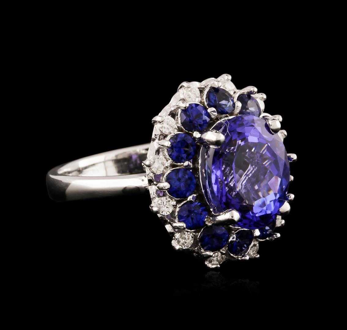 One electronically tested 14KT white gold ladies cast tanzanite, sapphire and diamond ring with a bright polish finish. Identified with markings of "14K". Condition is new. Containing: One prong set oval modified brilliant cut natural tanzanite, measuring 10.04 x 8.83 x 5.68mm, approximate weight of 3.54ct., clarity is eye clean, type I, medium light, very slightly grayish, bluish violet color, (GIA bV 4/3), cut is good. Twelve prong set round modified brilliant cut natural blue sapphires, measuring 2.90 - 2.90 x 1.89 mm, approximate total weight of 1.56ct., clarity is slightly included, type II, medium, moderately strong, blue color, (GIA B 5/4), cut is good. Twelve prong set round brilliant cut diamonds, measuring 2.00 - 2.00 x 1.20mm (depth est.) approximate total weight of 12 Stones = 0.35ct. Clarity: SI-1 to SI-2. Color: H - I, Cut is Good. Colored gemstones are presumed to have been subjected to commonly used enhancement processes. All diamonds and colored gemstones are graded in the mounting, unless otherwise stated. Total Weight of Colored Stones 5.10ct. Total Weight of Diamonds 0.35ct. Total Weight of Ring 7.00 grams. GGL Appraised at $4,430.00.