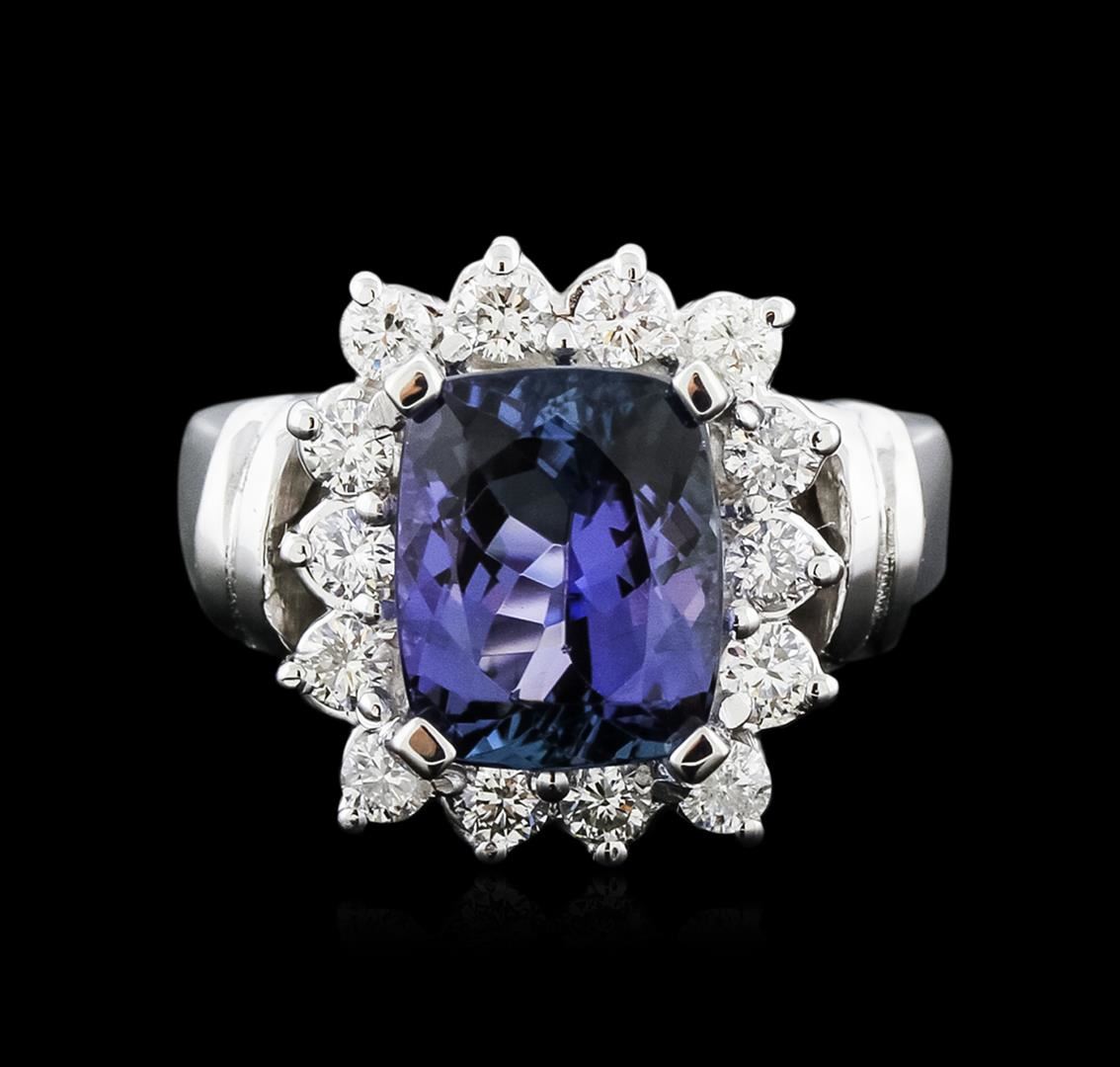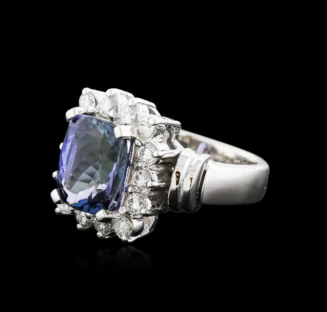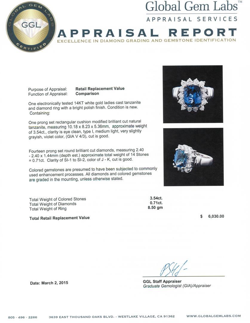 One electronically tested 14KT white gold ladies cast tanzanite and diamond ring with a bright polish finish. Condition is new. Containing: One prong set rectangular cushion modified brilliant cut natural tanzanite, measuring 10.18 x 8.23 x 5.36mm, approximate weight of 3.54ct., clarity is eye clean, type I, medium light, very slightly grayish, violet color, (GIA V 4/3), cut is good. Fourteen prong set round brilliant cut diamonds, measuring 2.40 - 2.40 x 1.44mm (depth est.) approximate total weight of 14 Stones = 0.71ct. Clarity: SI-1 to SI-2. Color: J - K, Cut is Good. Colored gemstones are presumed to have been subjected to commonly used enhancement processes. All diamonds and colored gemstones are graded in the mounting, unless otherwise stated. Total Weight of Colored Stones 3.54ct. Total Weight of Diamonds 0.71ct. Total Weight of Ring 8.50 grams. GGL Appraised at $6,030.00.