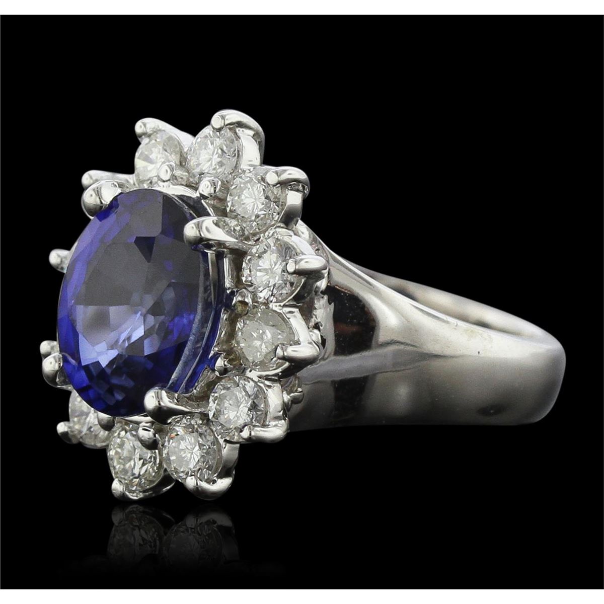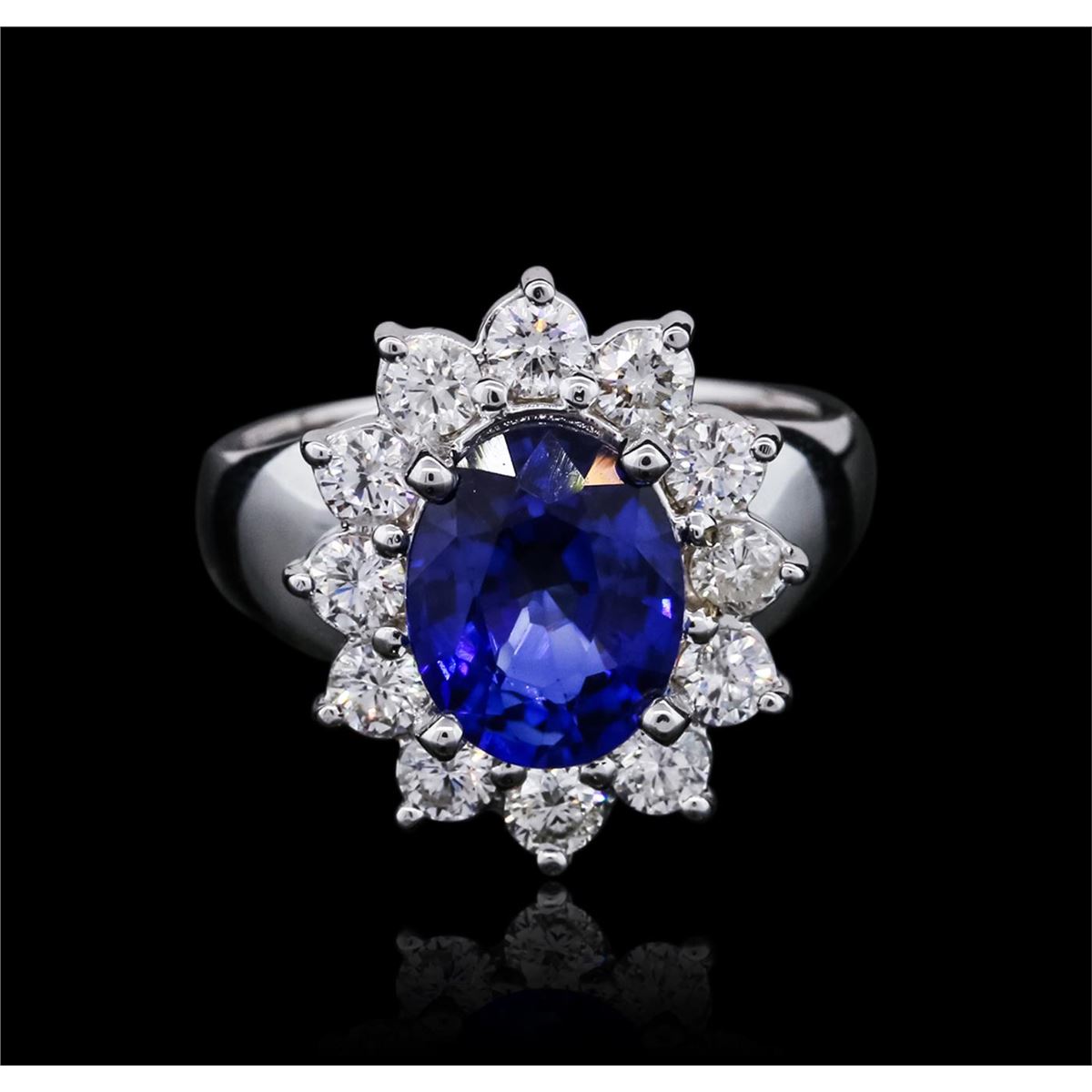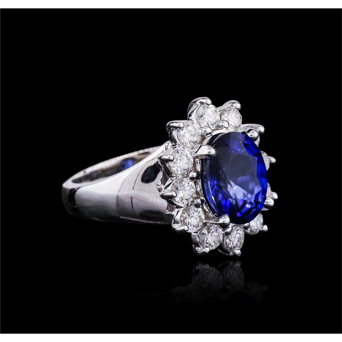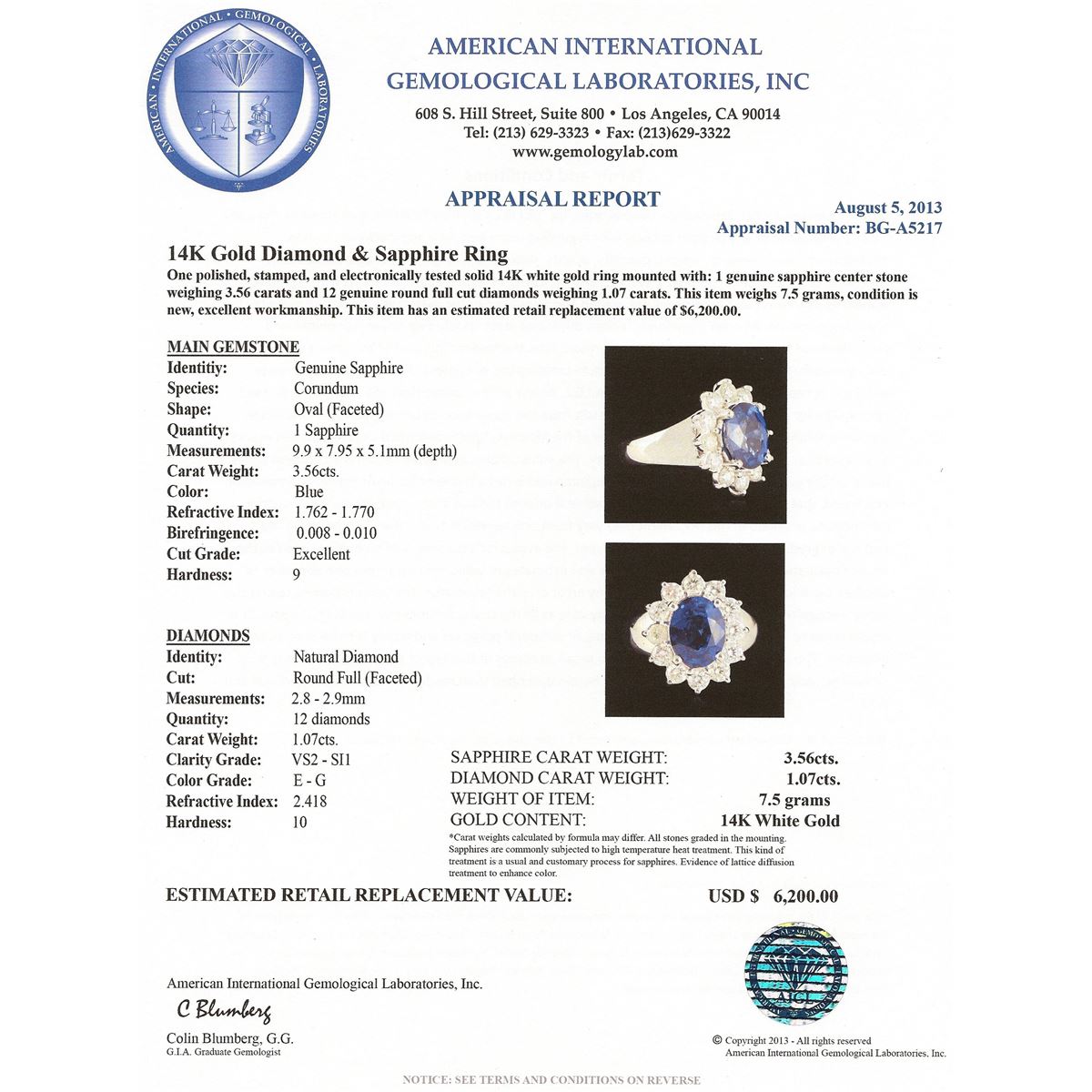 One polished, stamped, and electronically tested solid 14KT White Gold ring mounted with: 1 genuine sapphire center stone weighing 3.56 carats and 12 genuine round full cut diamonds weighing 1.07 carats. This item weighs 7.5 grams, condition is new, excellent workmanship. AIGL Appraised at $6,200.00.