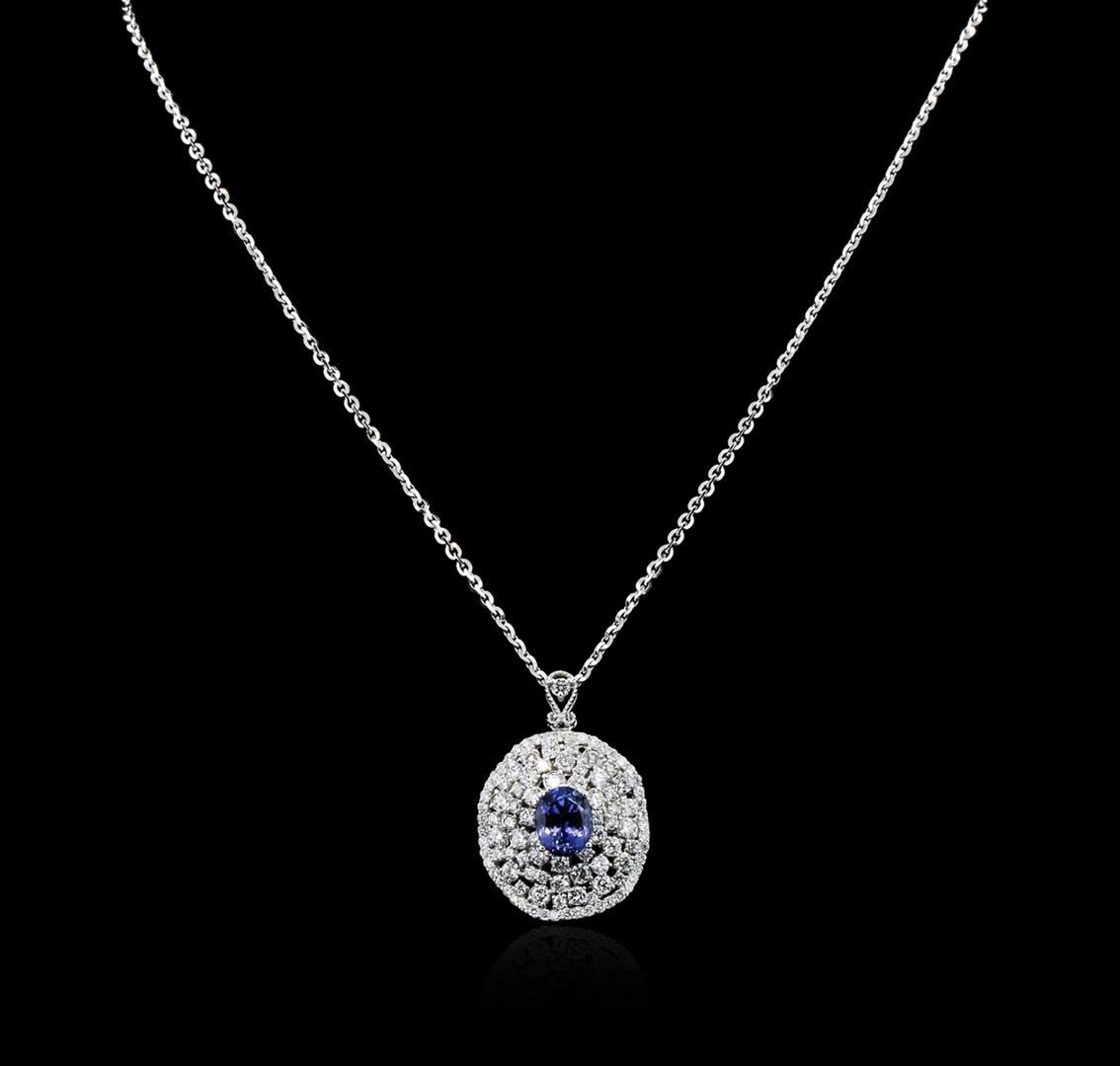 One electronically tested 14KT white gold ladies combination cast & assembled tanzanite and diamond pendant & chain 18.0" long, cable link with a lobster claw clasp with a bright polish finish. Identified with markings of "K14". Condition is new. Containing: One prong set oval modified brilliant cut natural tanzanite, measuring 10.00 x 8.15 x 6.23mm, approximate weight of 3.57ct., clarity is eye clean, type I, medium light, slightly grayish, violet color, (GIA V 4/2), cut is good. Forty-Nine prong set round brilliant cut diamonds, measuring 2.50 - 2.50 x 1.50mm (depth est.) approximate total weight of 49 Stones = 2.80ct. Clarity: SI-1. Color: J - K, Cut is Good. Fifty-Five prong set round brilliant cut diamonds, measuring 1.50 - 1.50 x 0.90mm (depth est.) approximate total weight of 55 Stones = 0.68ct. Clarity: SI-1 to I-1. Color: J - K, Cut is Good. All diamonds and colored gemstones are graded in the mounting, unless otherwise stated. Colored gemstones are presumed to have been subjected to commonly used enhancement processes. Total Weight of Colored Stones 3.57ct. Total Weight of Diamonds 3.48ct. Total Weight of Pendant & Chain 15.80 grams. GGL Appraised at $12,165.00.