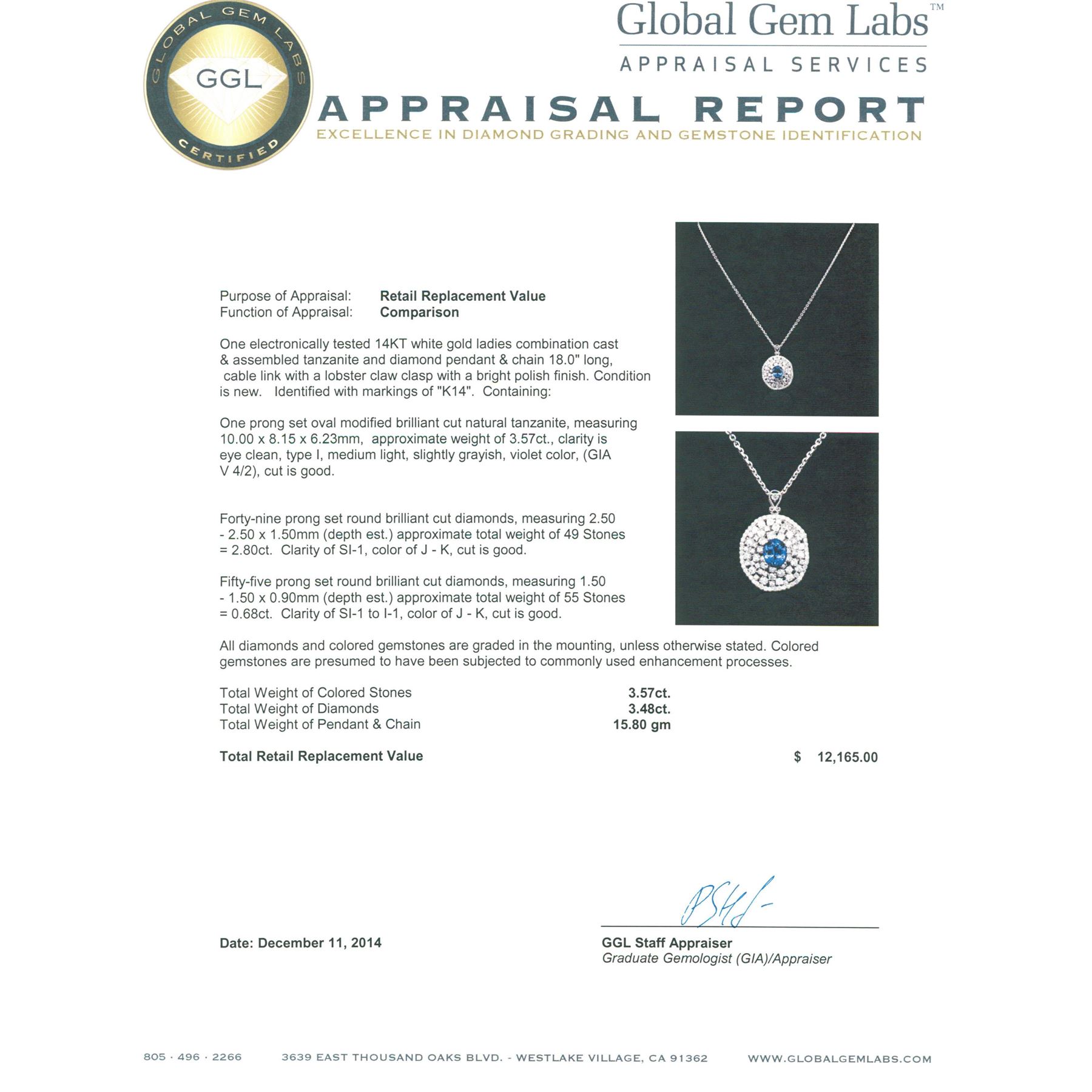 One electronically tested 14KT white gold ladies combination cast & assembled tanzanite and diamond pendant & chain 18.0" long, cable link with a lobster claw clasp with a bright polish finish. Identified with markings of "K14". Condition is new. Containing: One prong set oval modified brilliant cut natural tanzanite, measuring 10.00 x 8.15 x 6.23mm, approximate weight of 3.57ct., clarity is eye clean, type I, medium light, slightly grayish, violet color, (GIA V 4/2), cut is good. Forty-Nine prong set round brilliant cut diamonds, measuring 2.50 - 2.50 x 1.50mm (depth est.) approximate total weight of 49 Stones = 2.80 ct. Clarity: SI-1. Color: J - K, Cut is Good. Fifty-Five prong set round brilliant cut diamonds, measuring 1.50 - 1.50 x 0.90mm (depth est.) approximate total weight of 55 Stones = 0.68ct. Clarity: SI-1 to I-1. Color: J - K, Cut is Good. All diamonds and colored gemstones are graded in the mounting, unless otherwise stated. Colored gemstones are presumed to have been subjected to commonly used enhancement processes. Total Weight of Colored Stones 3.57ct. Total Weight of Diamonds 3.48ct. Total Weight of Pendant & Chain 15.80 grams. GGL Appraised.