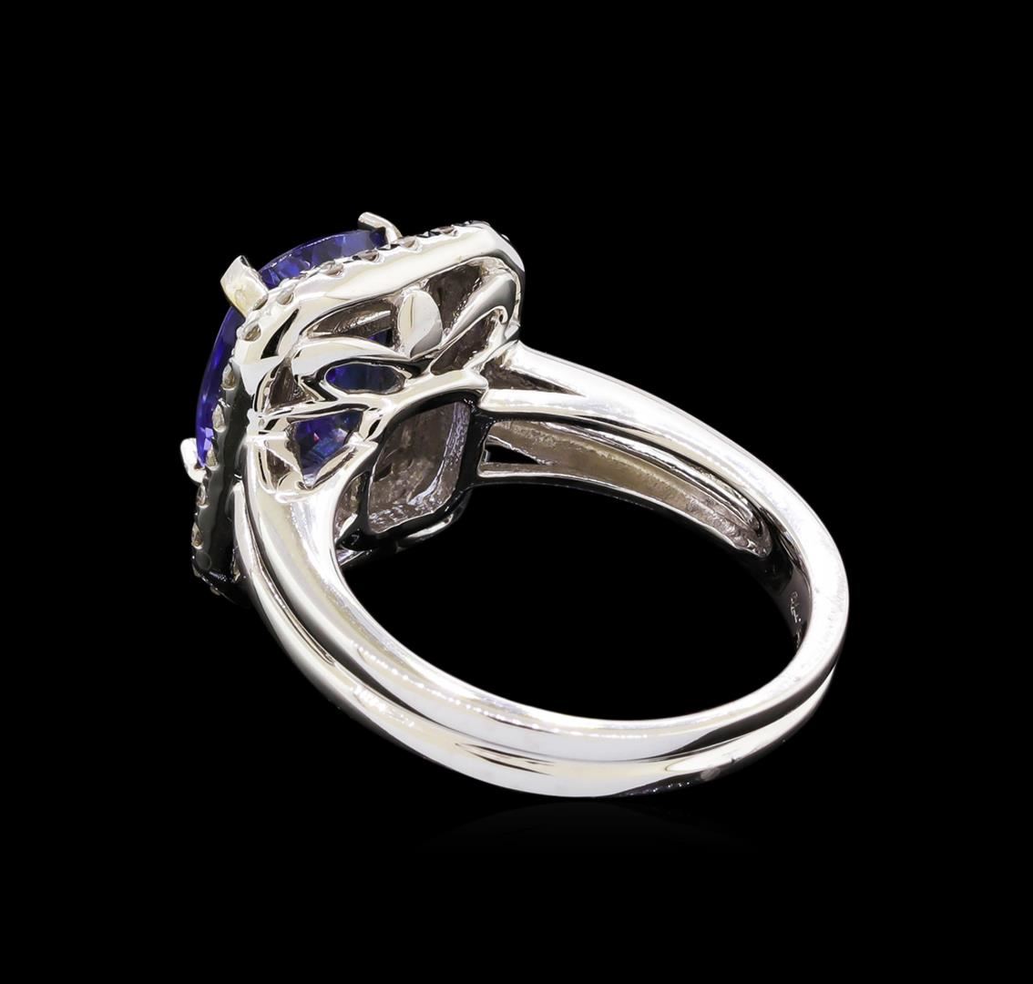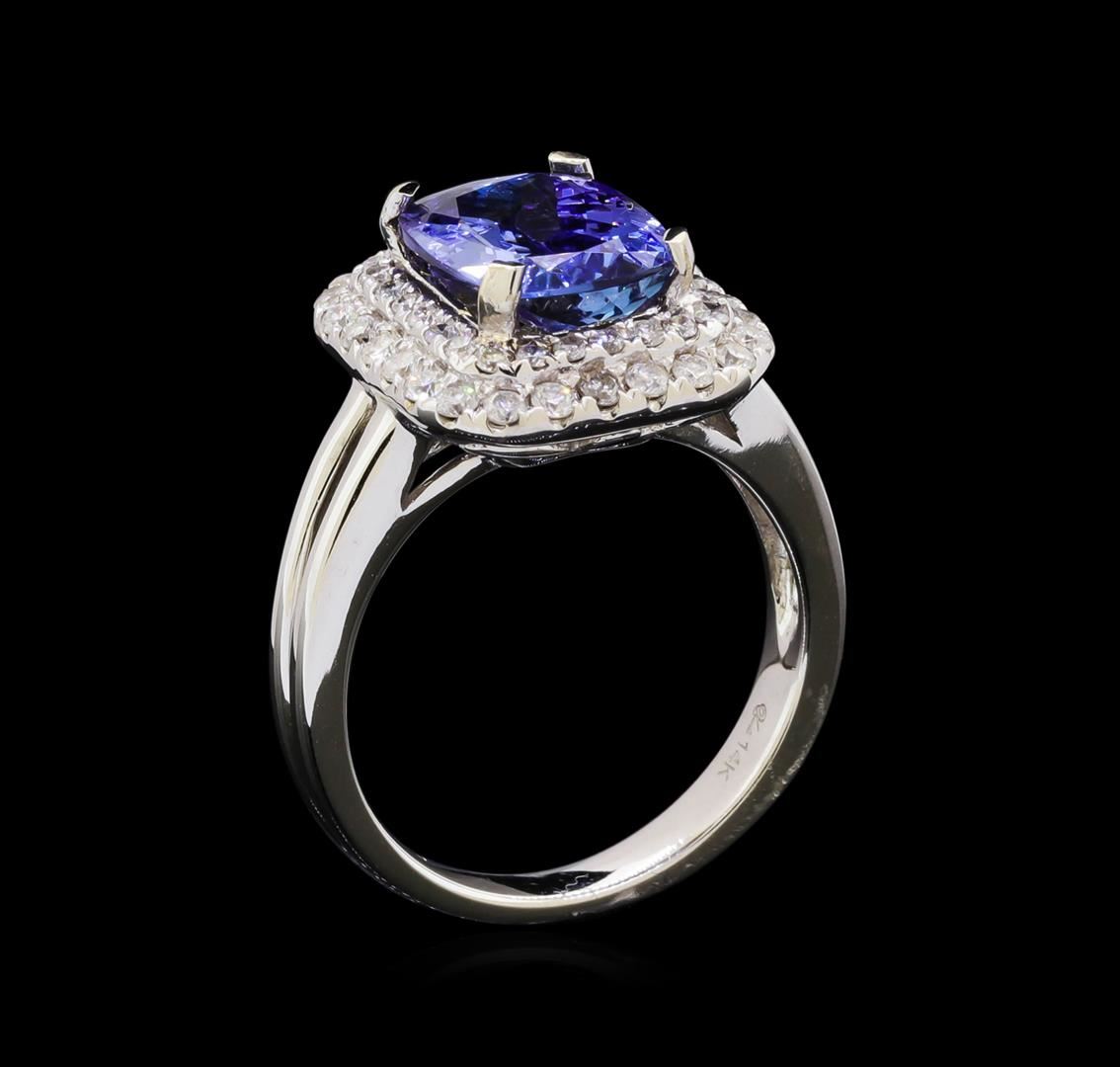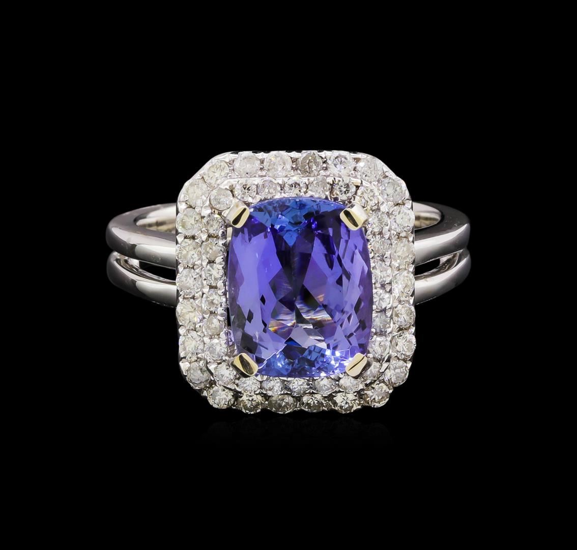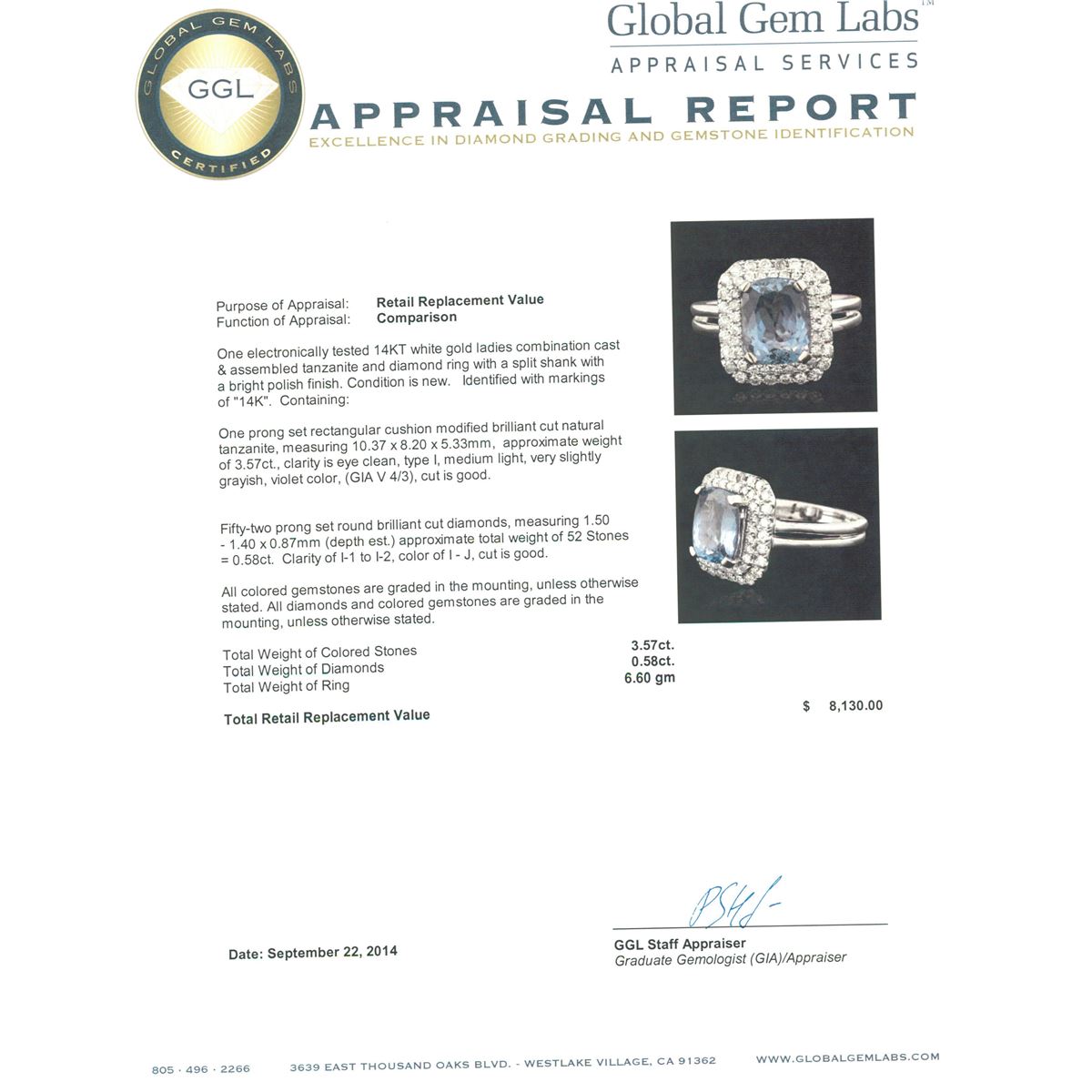 One electronically tested 14KT white gold ladies combination cast & assembled tanzanite and diamond ring with a split shank with a bright polish finish. Identified with markings of "14K". Condition is new. Containing: One prong set rectangular cushion modified brilliant cut natural tanzanite, measuring 10.37 x 8.20 x 5.33mm, approximate weight of 3.57ct., clarity is eye clean, type I, medium light, very slightly grayish, violet color, (GIA V 4/3), cut is good. Fifty-Two prong set round brilliant cut diamonds, measuring 1.50 - 1.40 x 0.87mm (depth est.) approximate total weight of 52 Stones = 0.58ct. Clarity: I-1 to I-2. Color: I - J, Cut is Good. All colored gemstones are graded in the mounting, unless otherwise stated. All diamonds and colored gemstones are graded in the mounting, unless otherwise stated. Total Weight of Colored Stones 3.57ct. Total Weight of Diamonds 0.58ct. Total Weight of Ring 6.60 grams. GGL Appraised at $8,130.00.