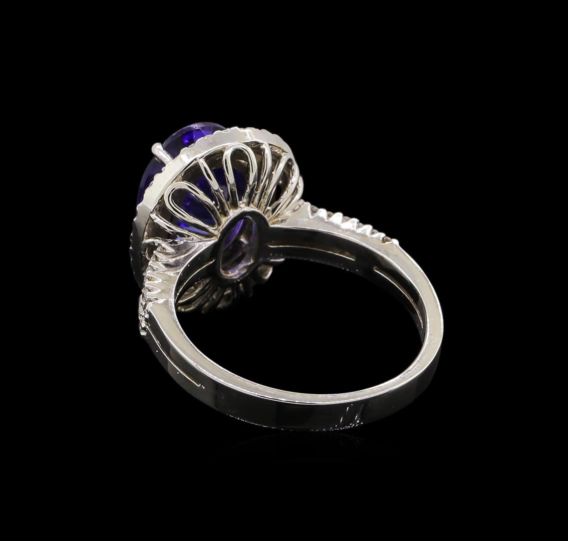 One electronically tested 14KT white gold ladies cast tanzanite and diamond ring with a bright polish finish. Identified with markings of "14K". Condition is new. Containing: One prong set oval modified brilliant cut natural tanzanite, measuring 10.50 x 7.80 x 6.20mm, approximate weight of 3.57ct., clarity is eye clean, type I, medium, moderately strong, violet color, (GIA V 5/4), cut is good. Eighty-Nine prong set round brilliant cut diamonds, measuring 1.30 - 1.30 x 0.78mm (depth est.) approximate total weight of 89 Stones = 0.71ct. Clarity: I-1. Color: H - I, Cut is Good. Colored gemstones are presumed to have been subjected to commonly used enhancement processes. All diamonds and colored gemstones are graded in the mounting, unless otherwise stated. Total Weight of Colored Stones 3.57ct. Total Weight of Diamonds 0.71ct. Total Weight of Ring 5.80 grams. GGL Appraised at $4,955.00.