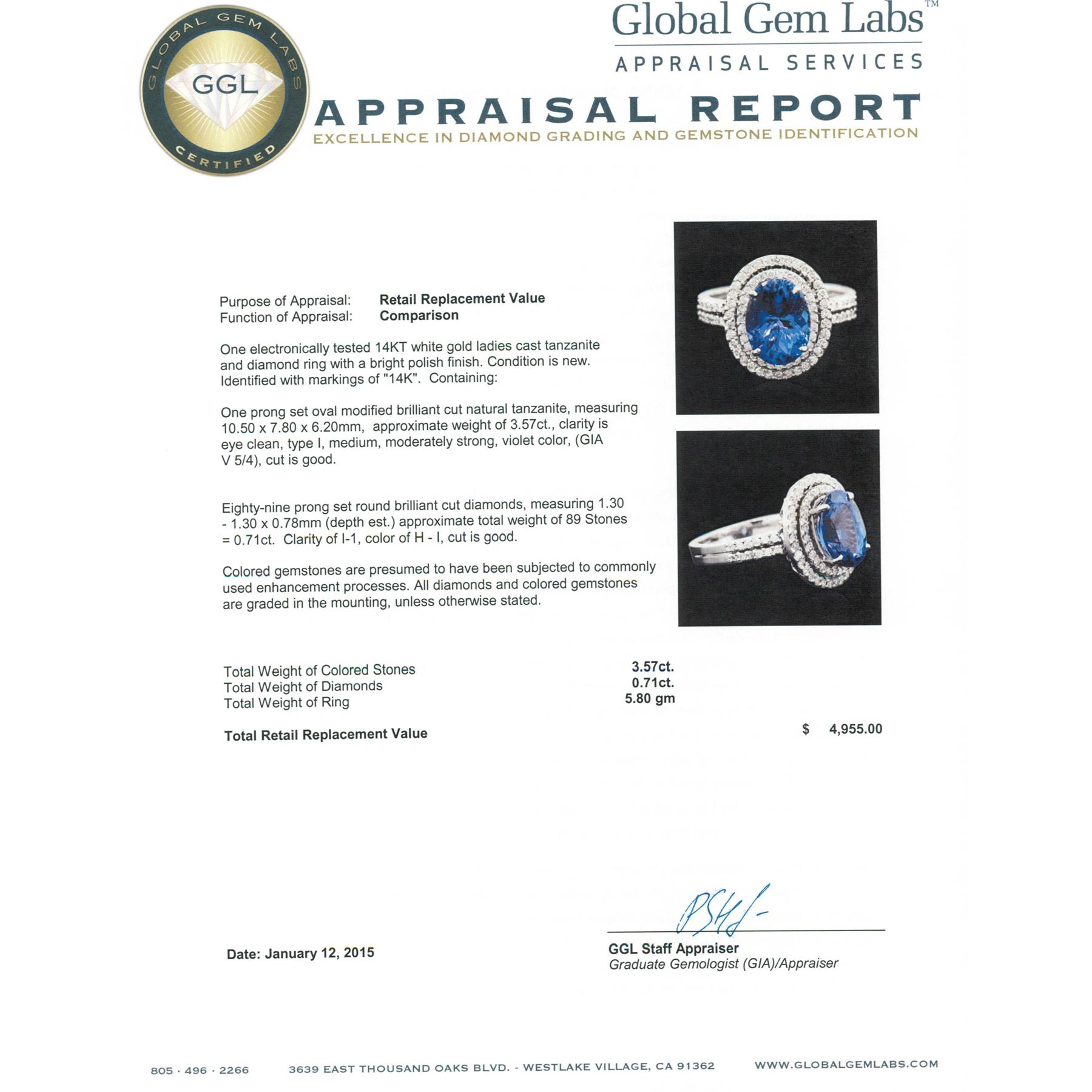 One electronically tested 14KT white gold ladies cast tanzanite and diamond ring with a bright polish finish. Identified with markings of "14K". Condition is new. Containing: One prong set oval modified brilliant cut natural tanzanite, measuring 10.50 x 7.80 x 6.20mm, approximate weight of 3.57ct., clarity is eye clean, type I, medium, moderately strong, violet color, (GIA V 5/4), cut is good. Eighty-Nine prong set round brilliant cut diamonds, measuring 1.30 - 1.30 x 0.78mm (depth est.) approximate total weight of 89 Stones = 0.71ct. Clarity: I-1. Color: H - I, Cut is Good. Colored gemstones are presumed to have been subjected to commonly used enhancement processes. All diamonds and colored gemstones are graded in the mounting, unless otherwise stated. Total Weight of Colored Stones 3.57ct. Total Weight of Diamonds 0.71ct. Total Weight of Ring 5.80 grams. GGL Appraised at $4,955.00.